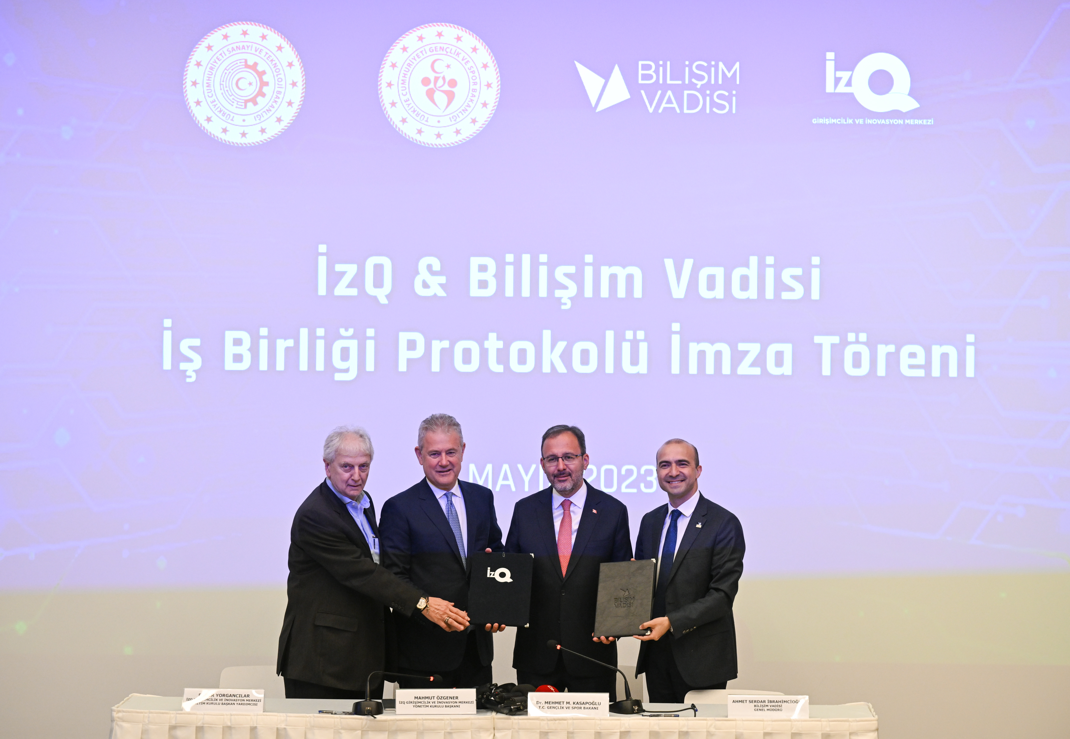 Diren ÇELİK/ EGEDESONSÖZ- İzQ & Bilişim Vadisi İş Birliği Protokolü İmza Töreni, Gençlik ve Spor Bakanı Mehmet M. Kasapoğlu'nun katılımıyla, İzQ İnovasyon Merkezi Büyük Etkinlik Salonu'nda gerçekleştirildi. Açılış konuşmalarının ardından imzalar atıldı.