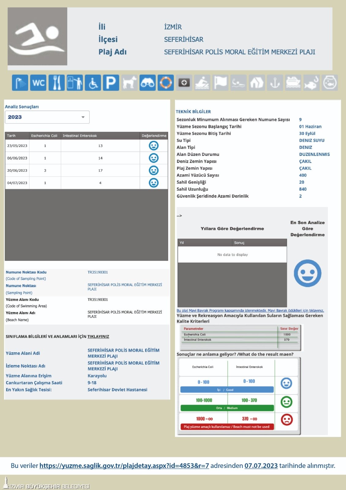 Sağlık Bakanlığı'na bağlı Halk Sağlığı Genel Müdürlüğü'nün plajdan aldığı numuneler de deniz suyunun yüzülebilirlik kriterlerine uygun olduğunu ortaya koydu.
