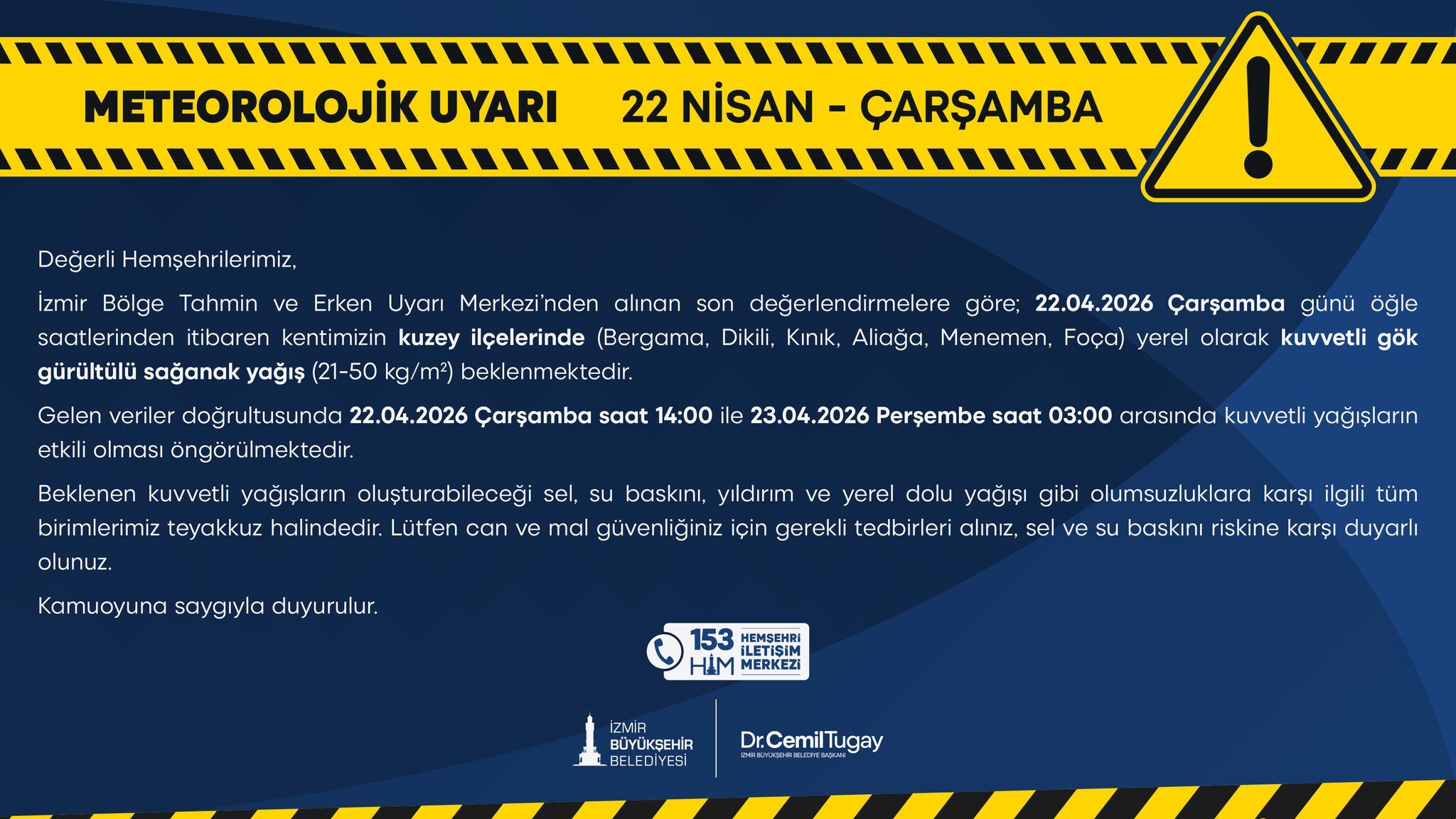 EGEDESONSÖZ- İZSU, 22 Nisan Çarşamba günü için kentin kuzey ilçelerini kapsayan önemli bir meteorolojik uyarı yayımladı.