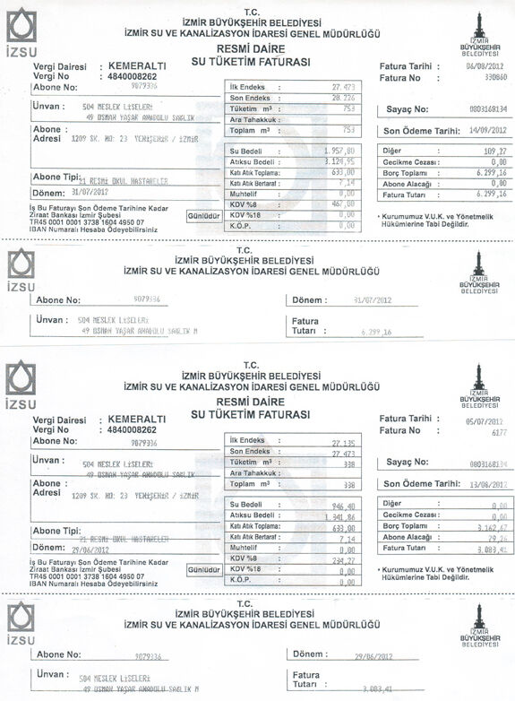Konu ile ilgili İZSU Genel Müdürlüğü yetkilileri, şu bilgileri vermiştir: 'Yaptığımız incelemeler sonucunda, okula su veren 9079336 nolu abonenin düzenli olarak okunduğu, yapılan okumalar sonucunda 29.06.2012 tarihinde 338 metreküp su kullanımının tespit edilerek 633 TL. katı atık bedeli dahil 3.162,67 TL, 31.07.2012 tarihli okumada 753 metreküp su kullandığı tespit edilerek 633 TL. katı atık bedeli de dahil 6.180,72TL, 31.08.2012 tarihli okumada ise 511 metreküp su kullandığı tespit edilerek yine 633 TL. katı atık bedeli dahil 4.416,54 TL. fatura çıkarılmıştır. Yapılan okumaların sayacın gösterdiği tüketime göre olduğu ve doğru şekilde yapıldığı tespit edilmiştir. Okul içerisinde yaptığımız araştırmalarda okulun bahçesinde yaklaşık 40-45 adet ağaç olduğu, bunların 2 inç kalınlığında bir hortumla sulandığı tespit edilmiştir. Görevli personelimize nezaret eden okul görevlisi de ağaçların sulandığını kendisi ifade etmiştir.