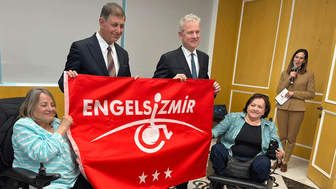 Berivan KAYA/EGEDESONSÖZ- İzmir Ticaret Odası engelli erişimine uygun hale getirilerek '3 yıldızlı Kırmızı Bayrak' ile ödüllendirildi. İzmir Büyükşehir Belediye Başkanı Cemil Tugay, engelli erişimine uygun hale getirilen İzmir Ticaret Odası’na kırmızı bayrak asılması törenine katıldı.