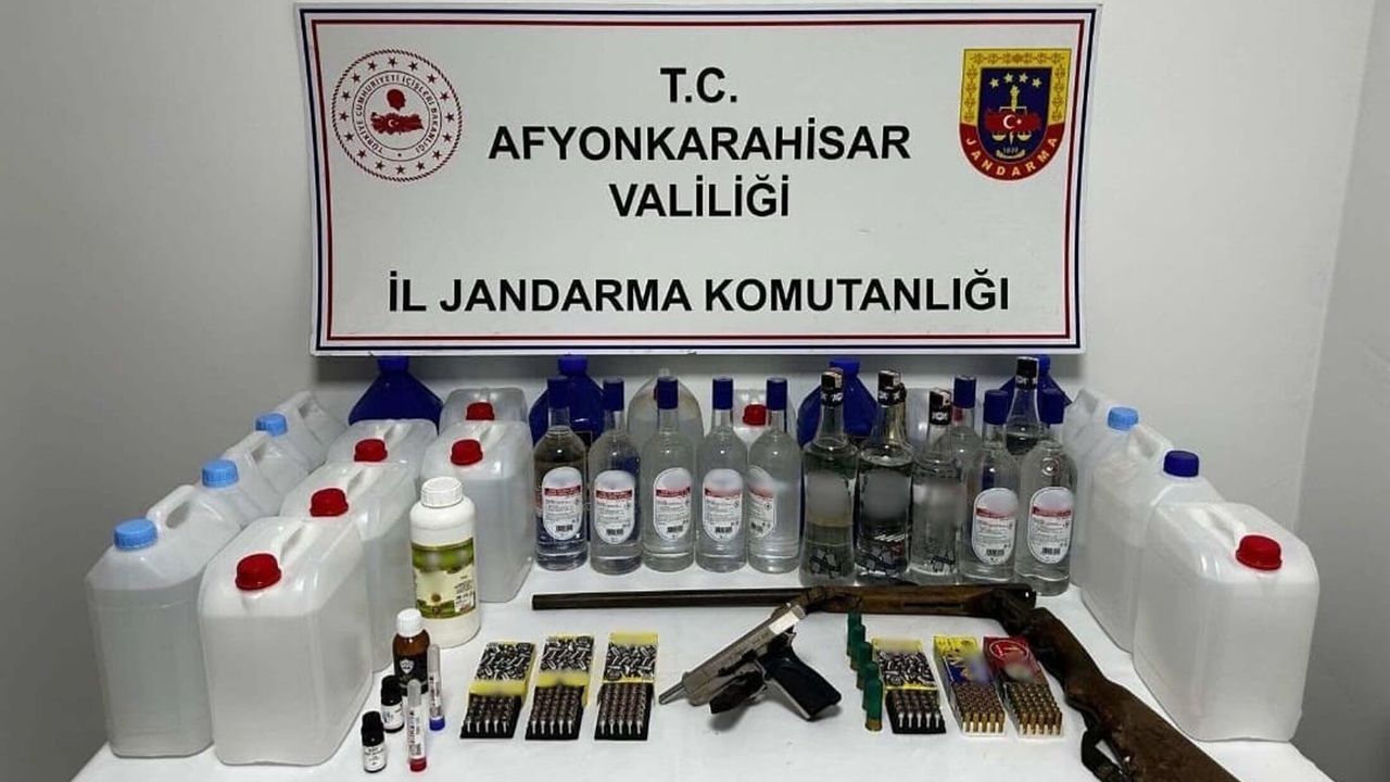 İl Jandarma Komutanlığı ekipleri Şuhut'a bağlı Oynağan köyünde düzenledikleri operasyonda 93 litre etil alkol, 2 alkol tatlandırıcı kit, 2 test kiti, 1,1 litre alkol tatlandırıcı, 5 litre el yapımı alkol, ruhsatsız av tüfeği, kurusıkı tabanca, 9 mm çapında 100 tabanca fişeği, 5 av tüfeği kartuşu, 173 kurusıkı tabanca fişeği ele geçirildi. H.H.S. ve T.S. hakkında yasal işlem başlatıldı. (DHA)