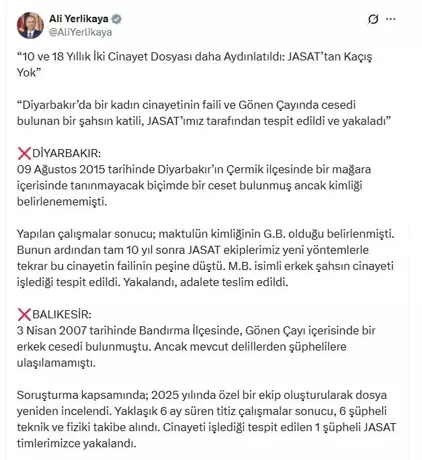 İçişleri Bakanı Ali Yerlikaya, JASAT tarafından yapılan çalışmaları sosyal medya hesabından paylaştı. Buna göre; 9 Ağustos 2015’te Diyarbakır'ın Çermik ilçesinde bir mağara içerisinde tanınmayacak biçimde bir ceset bulundu. Yapılan çalışmalar sonucu maktulün kimliğinin G.B. olduğu belirlendi. Olaydan 10 yıl sonra JASAT ekipleri yeni yöntemlerle failin peşine düştü. M.B. isimli erkek şüphelinin cinayeti işlediği tespit edildi. Yakalanan şüpheli, adalete teslim edildi.