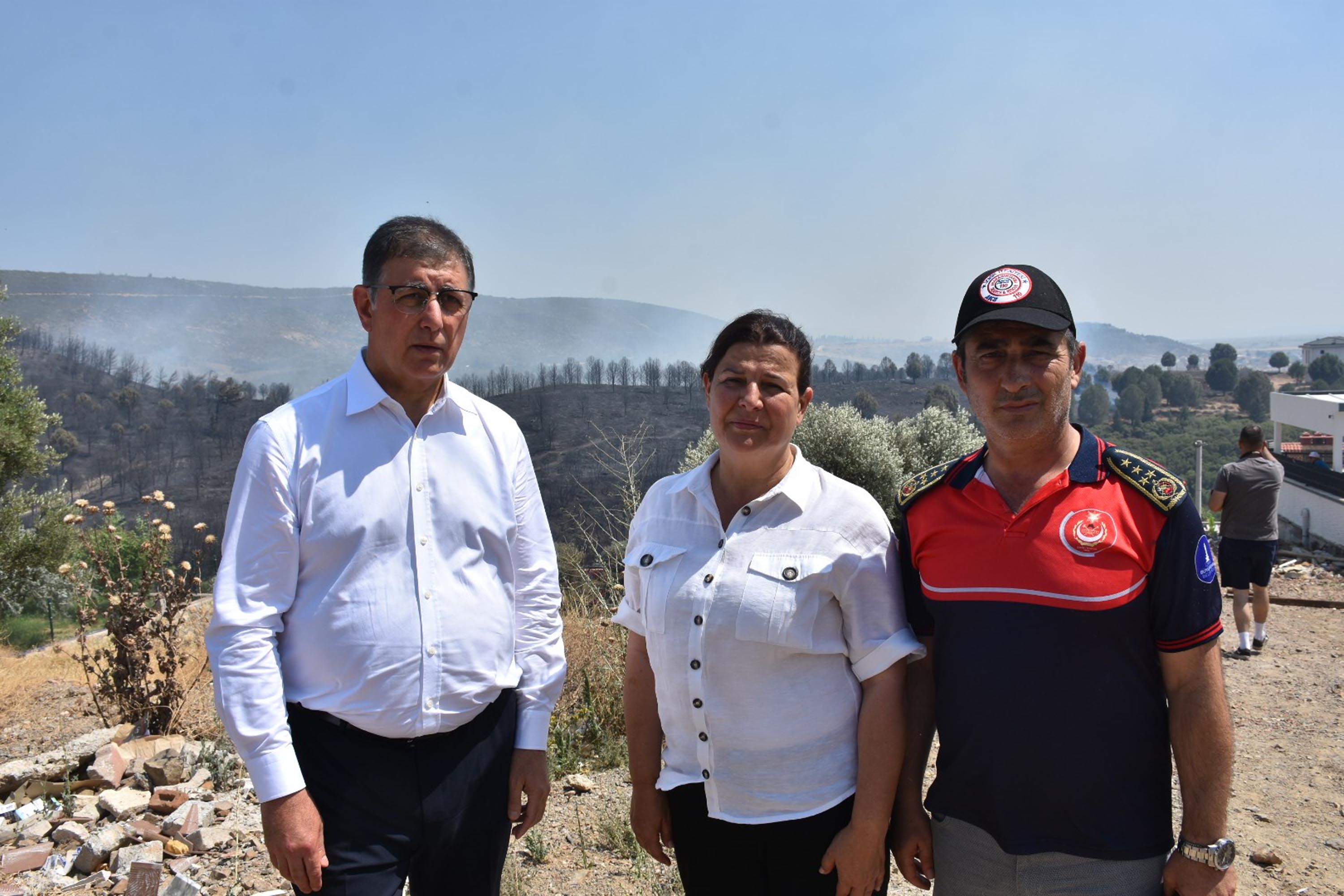 İzmir Büyükşehir Belediye Başkanı Cemil Tugay, Foça Belediye Başkanı Saniye Bora Fıçı ve İzmir Büyükşehir Belediyesi İtfaiye Daire Başkanı Yaşar Korkmaz ile söndürme çalışmalarını takip edip, bilgi aldı. Cemil Tugay, "Şu anda bir ölçüde kontrol altına alınmış gibi duruyor ama rüzgar var, devam ediyor. Herkesin gördüğü gibi hava sıcaklığı kuru, yanabilecek ağaç, bitki dokusu var. Rüzgarla beraber zaman zaman alevlenmeler oluyor. Karadan ulaşabildiğimiz her yere orman bölgeden, İzmir İtfaiyesinden, İzmir Büyükşehir Belediyesi’nin ve ilçe belediyelerinin araçlarıyla söndürme çalışmaları yapılıyor. Havadan söndürme için çalışan uçaklar ve helikopterler var. En büyük problem rüzgar ve sıcak hava. Böyle zamanlarda bir kıvılcımın çıkmasına bakıyor. 4 kilometre çaplı bir alanda devam ediyor, kontrol altına almaya çalışıyor arkadaşlar. Ama tam durmuş değil, yaralanma yok. Yerleşim yerlerinde herhangi bir hasar yok. Bazılarının bahçelerine kadar yakın bir yangın ama durdurmuş arkadaşlarımız. Ama tam durmuş değil yangın. İlerleyen saatlerde rüzgar olduğu için büyümeler olabilir diye tedbirli davranmaya çalışıyoruz. Yangın bir hobi bahçesi imalat sırasında bir kıvılcım ve buradan başlıyor. Allah aşkına çok rica ediyoruz bütün vatandaşlarımızdan piknik yapmayı bıraksınlar. Ormanlık alana yakın yerde yapmasınlar bunu. Yanan sigarayı sağa sola atmasınlar. Böyle zamanlarda özellikle rüzgarlı havalarda en ufacık bir şekilde yangın çıkarabilecek her türlü şeyden uzak dursunlar. Bu bir katliam. Ben insanların bunu bilerek yaptığını söylemiyorum ama bilmeden oldu demenin de bir anlamı yok. Bu zararı hiç kimsenin neden olma hakkı yok. Herkes çok dikkatli olmalı. Bu ağaçlar, bu bitkiler, bu doğa bizim canımız. Bunlar yok olduğu zaman işte yerine uzun yıllar yenisi gelmiyor. Bu kuraklıkta zaten bir şey yetiştirmek çok zor. Hakikaten isyan ediyoruz artık. Dikkatli olmak bu kadar zor olmamalı. Şu yanan sigarayı atmayın. Elinizde ateş çıkaran bir şey varsa onunla uğraşmayın. Şu piknik yapmayı da bırakın. Rüzgarlı havalarda lütfen ateşli her türlü şeyi uzak tutun ormanlardan, doğandan.'' dedi.