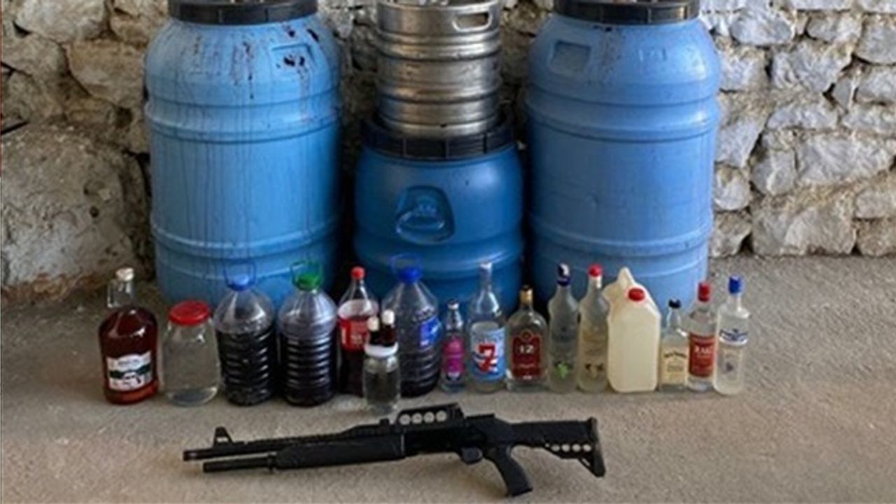 Adresteki aramada kaçak olarak üretilmiş 480 litre şarap, 3 litre viski ve 10 litre rakı ile 1 ruhsatsız av tüfeği ele geçirildi.