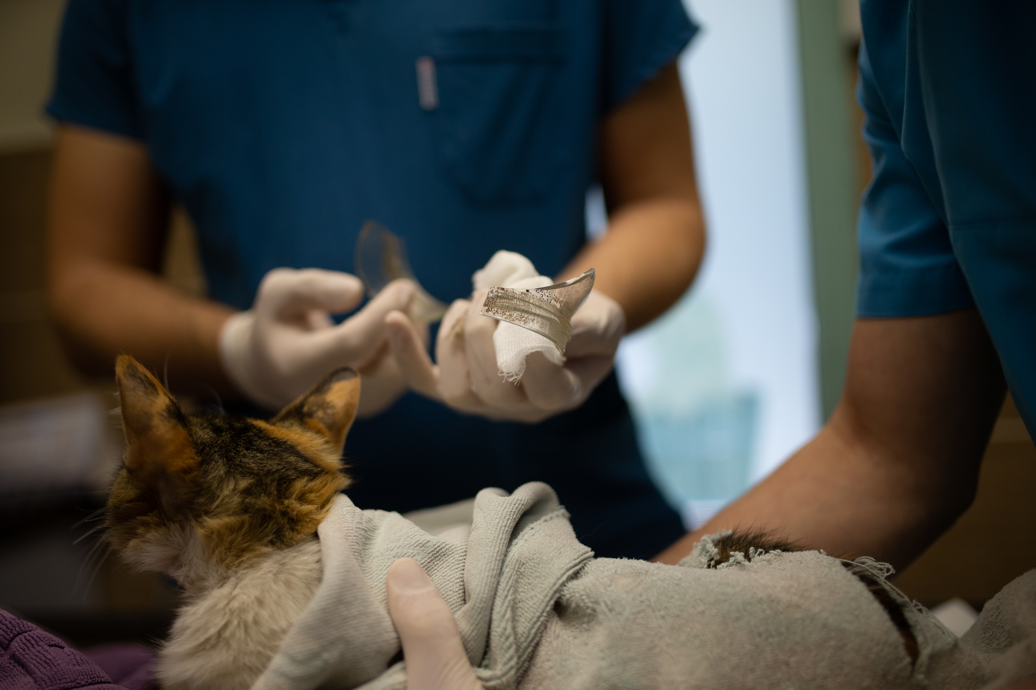 Görüntüleri izleyen hayvanseverler kediye yardım etmek üzere mahalleye geldi. Hayvanseverler, birkaç günde yakalayabildikleri kediyi veterinere götürdü. Kedi, veteriner hekim Anıl Aktoprak'ın müdahalesiyle boynundaki cam parçasından kurtarıldı.