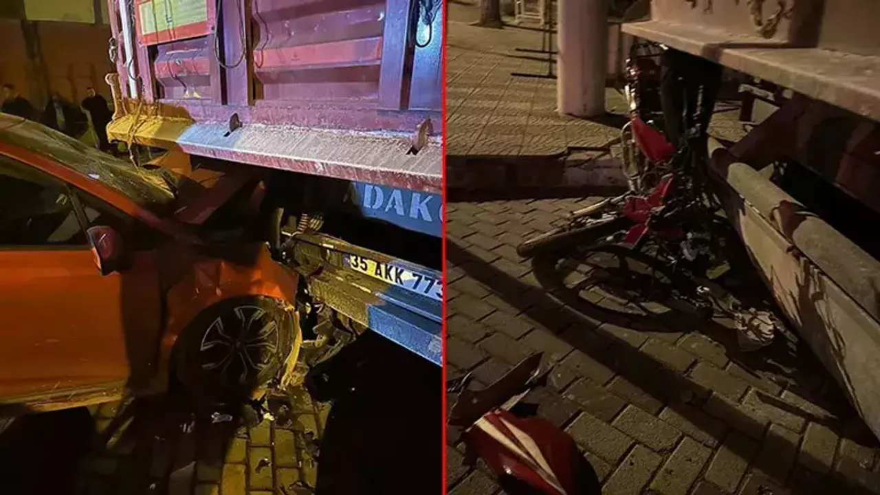 Kaza, saat 01.00 sıralarında Poyracık Mahallesi’nde meydana geldi. 35 CPB 428 plakalı otomobilin sürücüsü T.U. (36), yol kenarında uygulama yapan jandarma trafik ekiplerini görüp, hızını arttırdı. Ekiplerin takibe aldığı otomobil, Poyracık Mahallesi Bergama Caddesi'nde 35 BOC 845 plakalı motosiklete, ardından da park halindeki 35 BOC 845 plakalı TIR'ın dorsesine çarptı.
