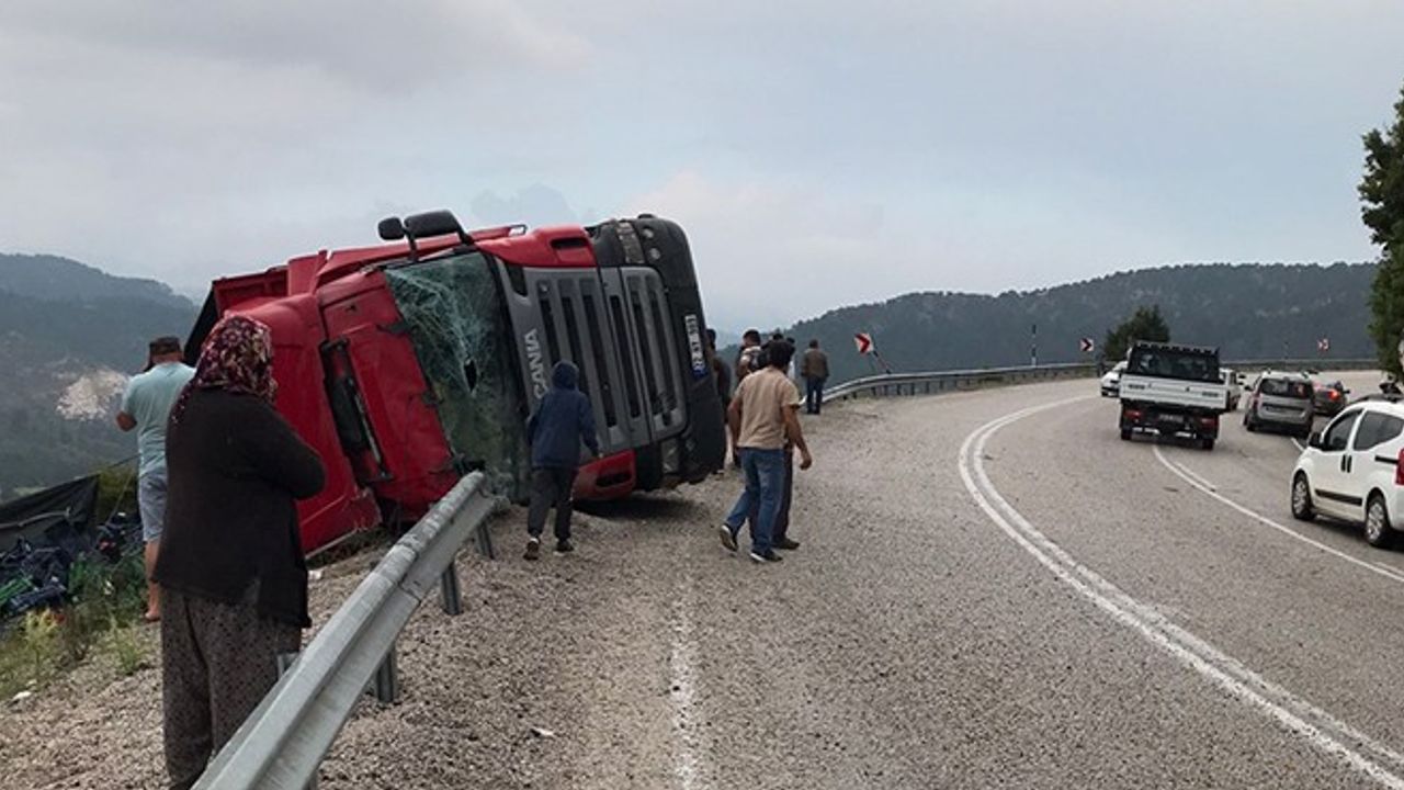 Fatih Yılmaz'ın kullandığı 22 HY 989 plakalı kamyon, Fethiye-Antalya kara yolu Karabel mevkisinde devrildi.