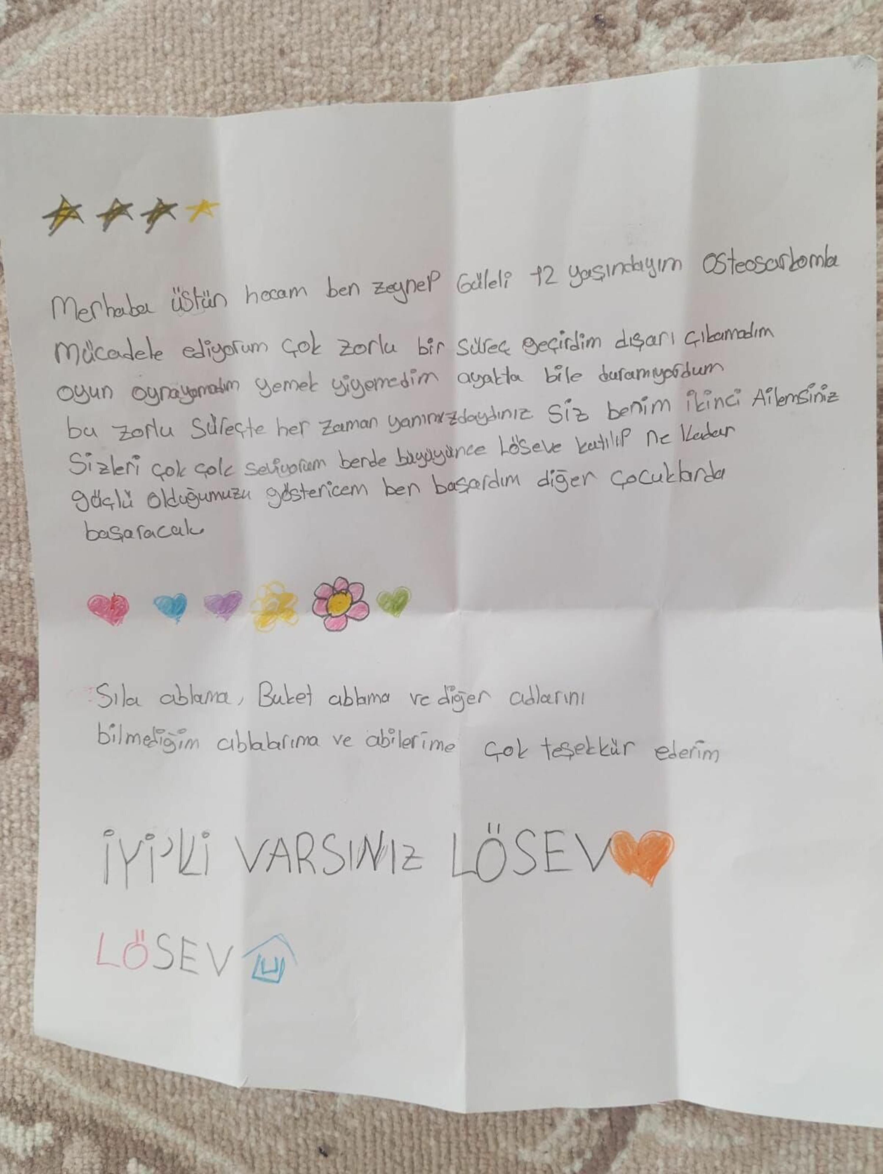 Okula tekrar başladığım için çok mutlu olduğunu belirten Güleli, "Bunun için kendime, hastalıkla mücadele eden arkadaşlarıma ve bana destek olanlara teşekkür mektubu yazdım. Mektubumda benim başardığımı ve sıranın diğer arkadaşlarımda olduğunu söyledim. Arkadaşlarım da okuyup, mücadele etsinler istedim. Çok zor bir süreçti ama başardım. Bu hastalıkla mücadele eden arkadaşlarım da başaracak buna eminim. Onlar da iyileşeceğini inansınlar ve yemek yesinler. Çünkü ben yemek yemiyordum" diye konuştu. Güleli, ileri de doktor olup, kendisi gibi hasta olan çocukları da iyileştirmek istediğini söyledi.