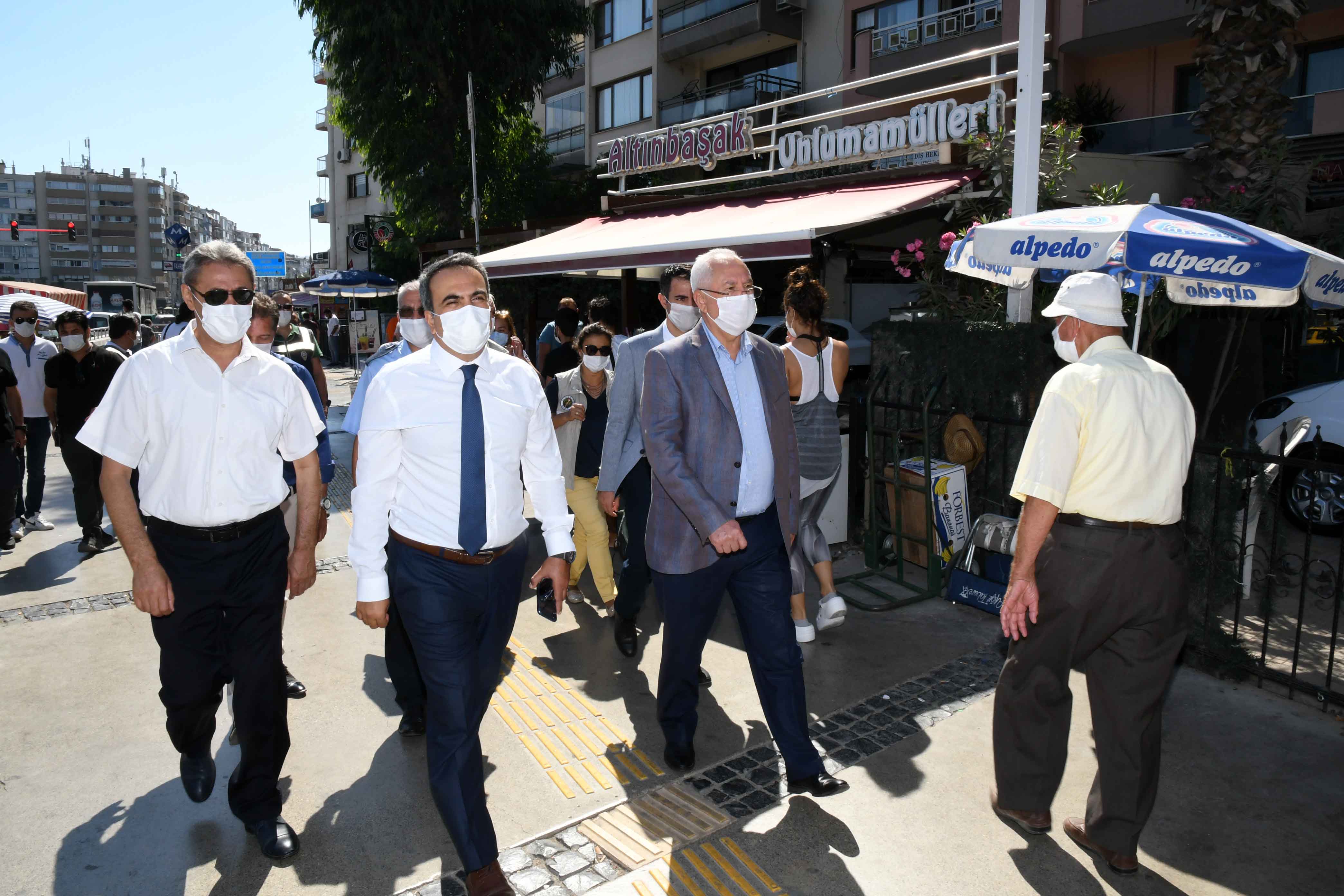 Karabağlar Kaymakamı Cemil Özgür Öneği ve Karabağlar Belediye Başkanı Muhittin Selvitopu, ilgili birim amirleriyle birlikte Fahrettin Altay Mahallesi'nde esnafı, Yunus Emre Mahallesi'nde de pazaryerini gezerek, maske, mesafe ve hijyen kurallarına uyulmasını istedi. Denetime, İzmir Fırıncılar Odası Başkanı Necdet Durmuş, İzmir Pazarcılar Odası Başkanı Hamdin Erişen'in yanı sıra, mahalle muhtarları, zabıta, ilçe emniyet, tarım ve orman müdürlüklerinden ekipler katıldı.