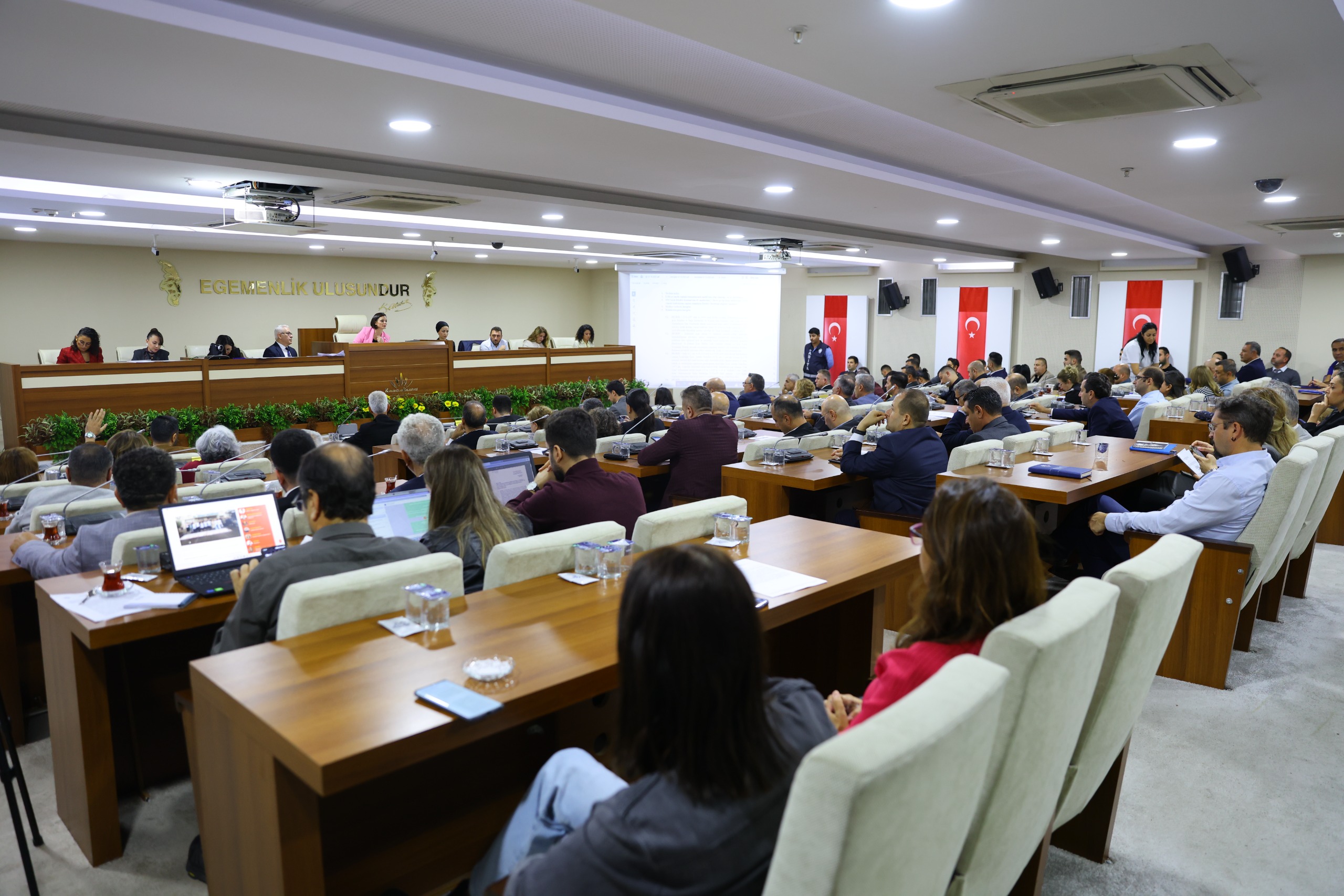 Muhittin AKBEL / EGEDESONSÖZ - Karabağlar Belediye Meclisi'nin Ekim ayı olağan toplantısının birinci birleşimi, Belediye Başkanı Helil Kınay yönetiminde gerçekleştirildi. Meclis toplantısını CHP Karabağlar İlçe Başkanı Volkan Gülboğa, Kadın Kolları Başkanı Gülüş Demirpençe, Gençlik Kolları Başkanı Ayça Gülenç, Kadın Kolları MYK üyesi Derya Dunabaş, MHP, YRP İlçe Başkanları ve AK Parti İlçe Başkan Yardımcısı da oturumu izledi.