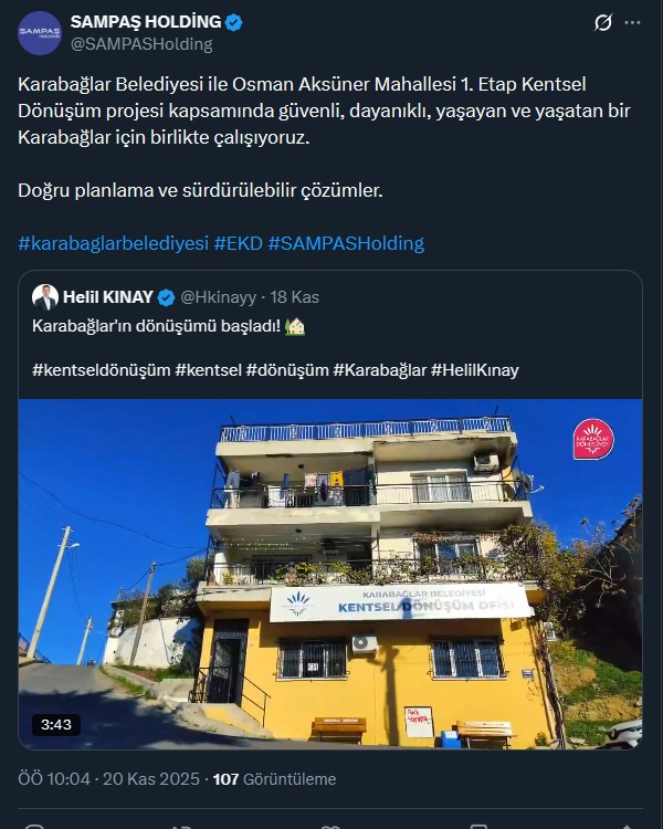 Sampaş Holding ise 20 Kasım 2025 tarihinde sosyal medya hesaplarında Karabağlar Belediyesi’nin Osman Aksüner Mahalllesi’ndeki kentsel dönüşümle ilgili videosunu “Karabağlar Belediyesi ile Osman Aksüner Mahallesi 1. Etap Kentsel Dönüşüm projesi kapsamında güvenli, dayanıklı, yaşayan ve yaşatan bir Karabağlar için birlikte çalışıyoruz. Doğru planlama ve sürdürülebilir çözümler” notuyla paylaştı.