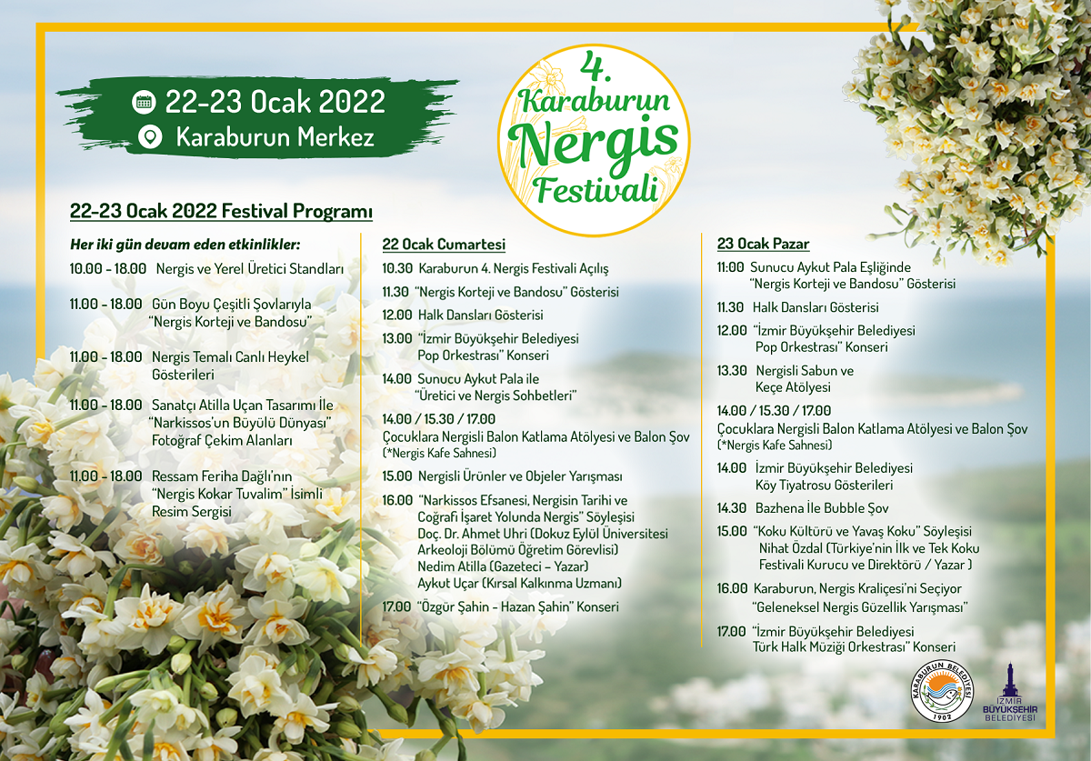 Karaburun Belediye Başkanı İlkay Girgin Erdoğan, festivale üç gün kala ilçede hummalı bir çalışmanın sürdüğünü belirterek, 'Misafirlerimizi en iyi şekilde ağırlamak için tüm üreticilerimiz ile birlikte hazırlanıyoruz. Festivalimiz nergis çiçeğinin yanı sıra zingatadan dede sarığına, keşkekten öküz köftesine, keçi peynirinden hurma zeytinine ve onlarca çeşit reçellerimize kadar; Karaburun'a özgü damak çatlatan yemeklerimizin, tatlılarımızın, yöresel lezzetlerimizin resmi geçidine sahne olacak' dedi.