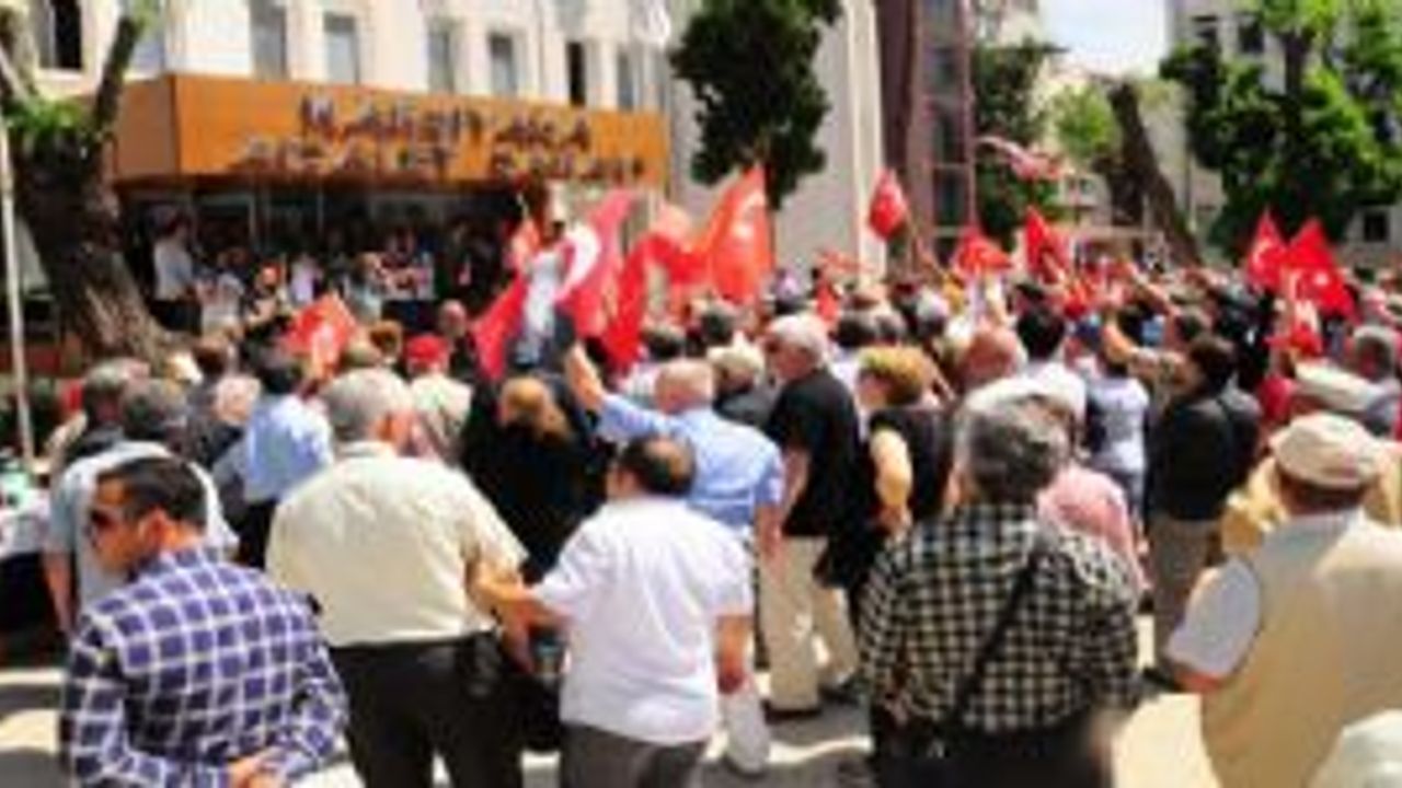 İZMİR - Cumhuriyetçi Avukatlar Grubu'na mensup avukatlar ile CHP Karşıyaka İlçe Kadın Kolları üyeleri ve vatandaşlar, ellerinde Türk bayrakları, Atatürk posterleri ile Karşıkaya Adliyesi önünde toplandı.