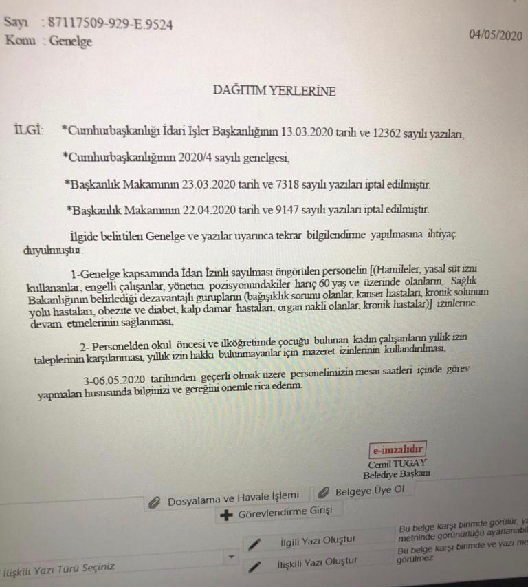 Gelişmenin çarpıtılarak duyurulduğunun altını çizen Tugay, 'Artık ben bu çarpıtmalara alıştım. Cumhurbaşkanlığı, İçişleri Bakanlığı ve üst makamlarımızdan gelen genelgelerin gereği yapılıyor. Nedir onlar? '60 yaşın üzerinde olan, hamile olan, kronik hastalığı bulunanlar mutlaka çalıştırılmayacak, idari izinli sayılacak, eve gönderilecek' deniyor. Bunların hepsi aynı şekilde izinli durumda… 12 yaşın altında çocuğu olanlarla ilgili genelge şöyle diyor; 'öncelikle yıllık izin kullanma hakkı kullandırılacak. Yıllık izni olmayanlara mazeret izni kullandırılacak. Ama bunların izin almasına engel olunmayacak' deniyor. Bunlarla ilgili de hiçbir sıkıntı yok. Bunların dışında benim kendi inisiyatifimle almış olduğum karar vardı. Bu konuda bizi zorlayan da hiçbir şey yoktu. Mesai saatlerini daraltmıştık. Ve de belli sayıda arkadaşımızı yine kendi inisiyatifimizle evine göndermiş ya da idari izinli saymıştık, evden çalışır hale getirmiştik. Şimdi artık yavaş yavaş normalleşme süreci içinde geriye doğru adım atabileceğimiz bir şey. Zaten benim kararımla aldığım bir şeydi, başka belediyelerde uygulanmayan bir uygulamaydı. Onu geriye çevirdik sadece. Mesai saatini eski haline getirdik. Yine benim kararımla evine gönderdiğimiz arkadaşları tekrar normal mesaiye çağırdık. Bunda eleştirilecek bir şey yok' dedi.
