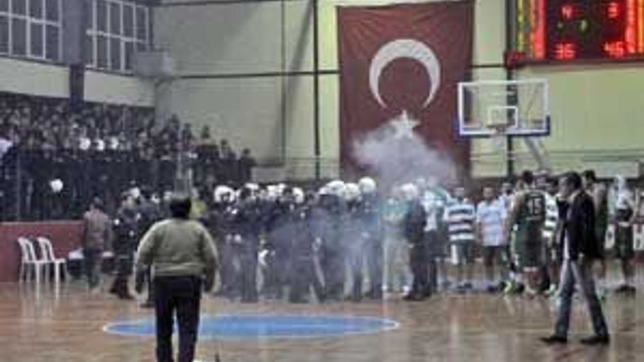 Karşıyaka Belediye Başkanı Hüseyin Mutlu Akpınar'ın da izlediği maçın üçüncü periyodunda konuk takım 46-36 öndeyken sahaya yabancı atılınca üçüncü anonsu da yaptıran hakemler salonun boşaltılmasını istedi. Bu esnada çevik kuvvetle seyirciler arasında çıkan arbede 1 polis ve 2 taraftar yaralandı. Güvenlik güçlerinin kullandığı biber gazından oyuncular ve aileler de etkilenirken, salon dışında devam eden olaylar sırasında tesisin ve Bursaspor otobüsünün camları kırıldı. Salon boşaltıldıktan sonra saat 20.00'de biten maçtan sonra konuk kafile geceyi İzmir'de geçirmek zorunda kaldı.(dha)
