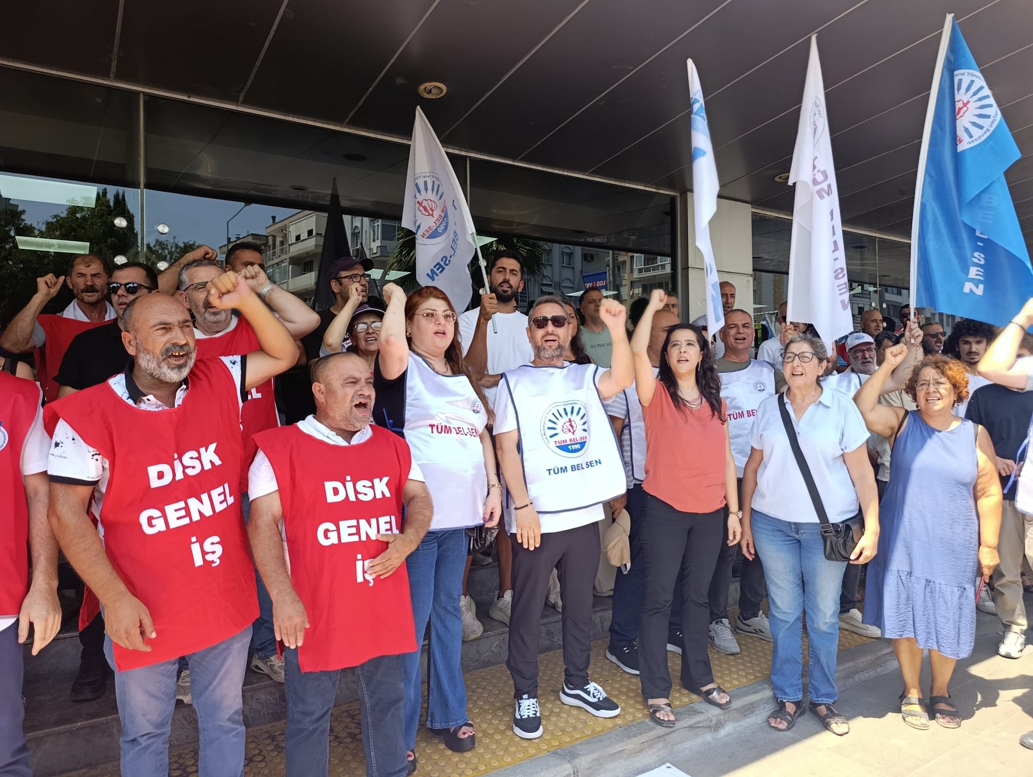 Genel İş İzmir 10 Nolu Şube bir süredir maşalarındaki gecikmelerden dolayı belediye önünde başlattığı eylemlere memur sendikaları Tüm Bel-Sen, Tüm Yerel-Sen ve Birlik Yerel-Sen de dahil oldu. Atılan sloganlarla belediye yönetiminden kararı çekmesi ve eksik ödemeleri zamanında yatırması istendi. İşçi ve memurlar ‘Bize ekmek yoksa size huzur yok’, ‘Direne direne kazanacağız’ sloganları attı.