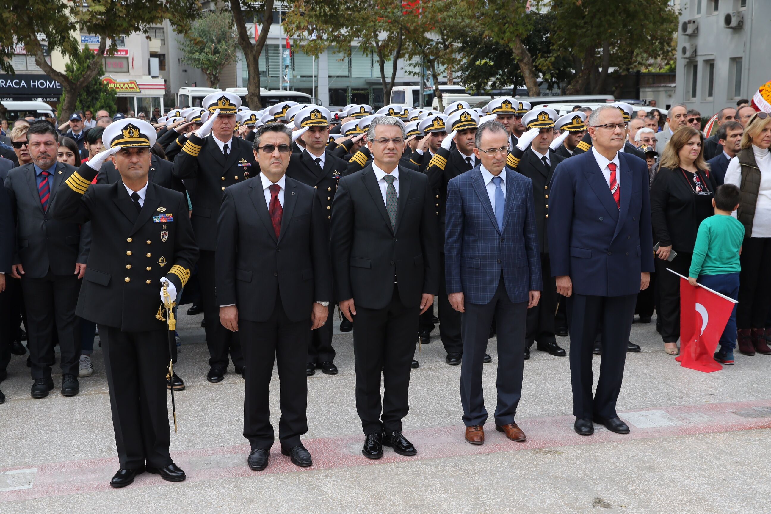 Karşıyaka Kaymakamı Sadettin Yücel, Karşıyaka Belediye Başkanı Hüseyin Mutlu Akpınar, resmi kurumların temsilcileri ve sivil toplum kuruluşları Atatürk Anıtı'na çelenk bıraktı. Saygı duruşu ve İstiklal Marşı'nın okunmasının ardından, Cumhuriyet'e ve Atatürk ilkelerine bağlılık mesajları verildi.