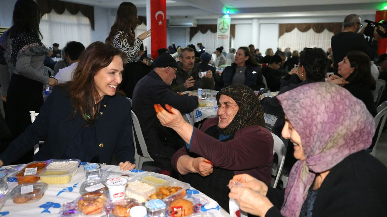 Ramazan ayı boyunca kentin farklı noktalarında binlerce vatandaşı aynı sofrada buluşturmayı amaçlayan Karşıyaka Belediyesi, yılın ilk iftar programını Cumhuriyet Mahallesi Düğün Salonu’nda gerçekleştirdi. Belediye Başkanı Yıldız Ünsal’ın ev sahipliğindeki iftar yemeğine; Cumhuriyet Mahallesi Muhtarı Özay Dağhan, Latife Hanım Mahallesi Muhtarı Levent Bozkurt, Belediye meclis üyeleri ve vatandaşlar katıldı. Hoca Yusuf Işık’ın yaptırdığı duanın ardından okunan ezanla birlikte oruçlarını açan vatandaşlar, dayanışmanın ve paylaşmanın mutluluğunu yaşadı. İftar sonrasında ise kurulan perdede sahnelenen geleneksel gölge oyunu, programa ayrı bir renk kattı. Hakan Fidan’ın ustalıkla hayat verdiği Hacivat ve Karagöz karakterleri hem çocuklara neşeli anlar yaşattı hem de büyüklere o özlenen eski Ramazanların tadını anımsattı.