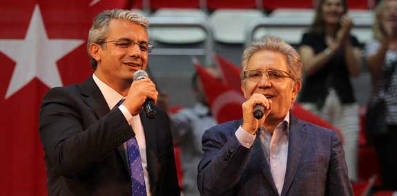 Sözleri sık sık alkışlarla kesilen Livaneli, salonda bulunan binlerce Karşıyakalı'nın 'Leylim Ley' ısrarını da geri çevirmedi. Sevilen şarkıyı salondakilerle birlikte seslendiren Livaneli'ye, Karşıyaka Belediye Başkanı Hüseyin Mutlu Akpınar da eşlik etti. Livaneli; Başkan Akpınar'ın, geçtiğimiz aylarda vefat eden babası Kenan Akpınar'ın, Ereğli Belediye Başkanlığı döneminde, belediye hoparlöründen 'Leylim Ley' şarkısını dinlettiği için 2 yıl hapis cezası aldığını da hatırlatarak 'Bu şarkıyı rahmetli Akpınar'ın hatırasına söylüyorum' dedi. Başkan Hüseyin Mutlu Akpınar ise 'Cumhuriyet değerlerine sahip çıkan, Ulu Önder Atatürk'ün annesi Zübeyde Hanım'ı sinesinde barındıran Karşıyaka'ya hoşgeldiniz' ifadelerini kullandı.