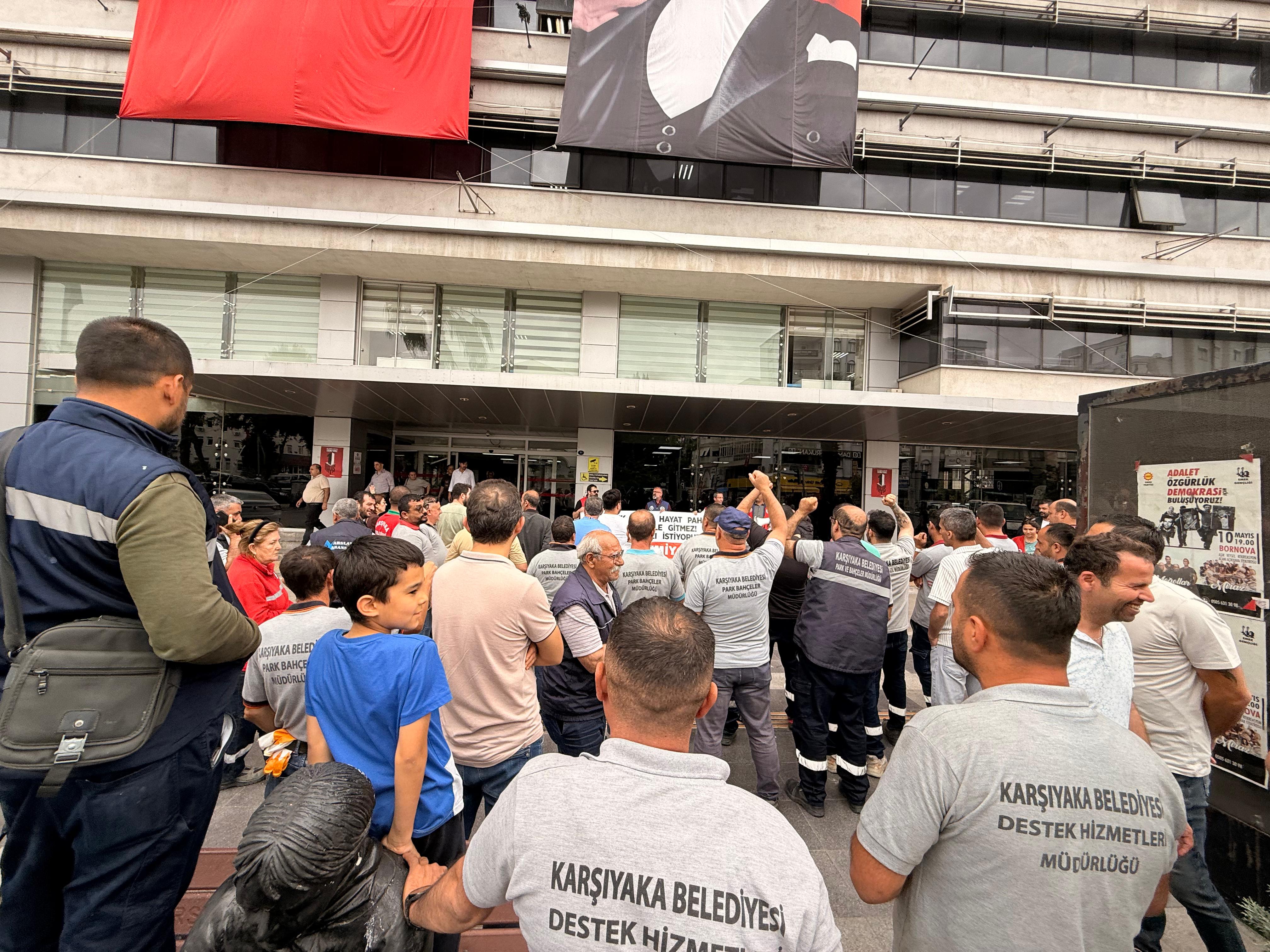 Bizler kamu işçisiyiz, işimize, evimize, çocuklarımıza ve Karşıyaka halkına karşı görevlerimiz var bunun bilincindeyiz, sizden de güler yüzle canla başla çalışmamızın karşılığı olan hakkımızı talep ediyoruz.