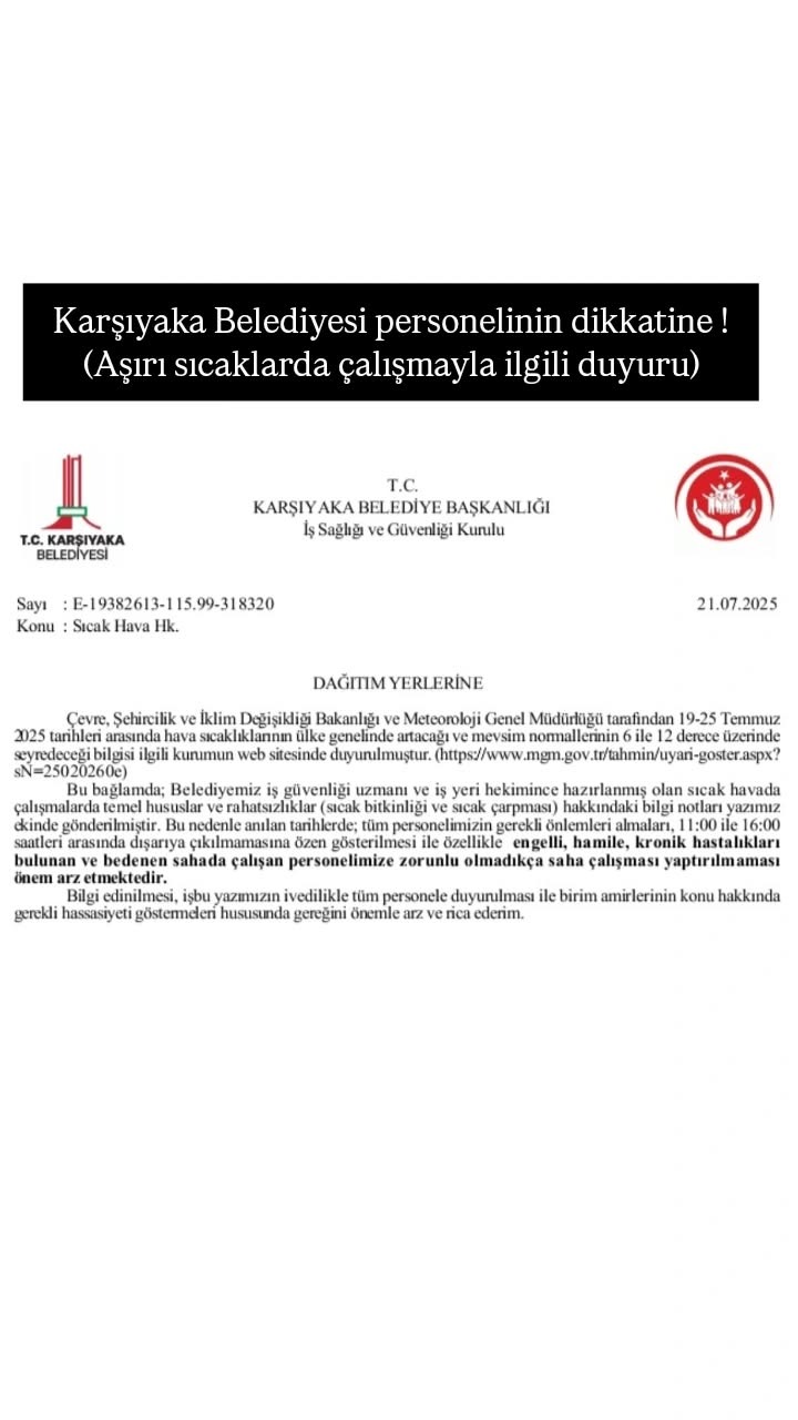 EGEDESONSÖZ- Karşıyaka Belediyesi İş Sağlığı ve Güvenliği Kurulu'ndan birimlere gönderilen yazıda, 19-25 Temmuz tarihleri arasında hava sıcaklıklarının artması sebebiyle personellere, zorunlu olmadıkça saha çalışması yaptırılmaması gerektiği belirtildi.