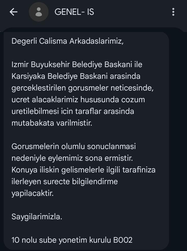 Metehan UD/ EGEDESONSÖZ- Karşıyaka Belediyesi’nde örgütlü bulunan DİSK/Genel-İş 10 No’lu Şube, belediyenin daha önce verdiği ödeme sözünü yerine getirmemesi üzerine süresiz iş bırakma kararı almıştı.