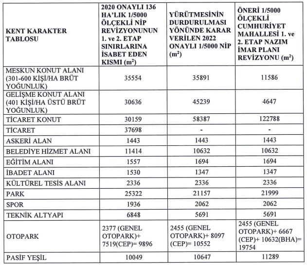 Askıya çıkan 1/5000 Ölçekli Cumhuriyet Mahallesi 1. Ve 2. Etap nazım İmar Planı'nın ana gerekçesi odaların ve vatandaşlarının itirazları ve mahkemenin 1/1000 ölçekli Ölçekli Cumhuriyet Mahallesi 1. Ve 2. Etap Uygulama İmar Planı ile ilgili verdiği yürütmeyi durdurma kararı verdiği doğrultusunda düzenleme gösterildi.