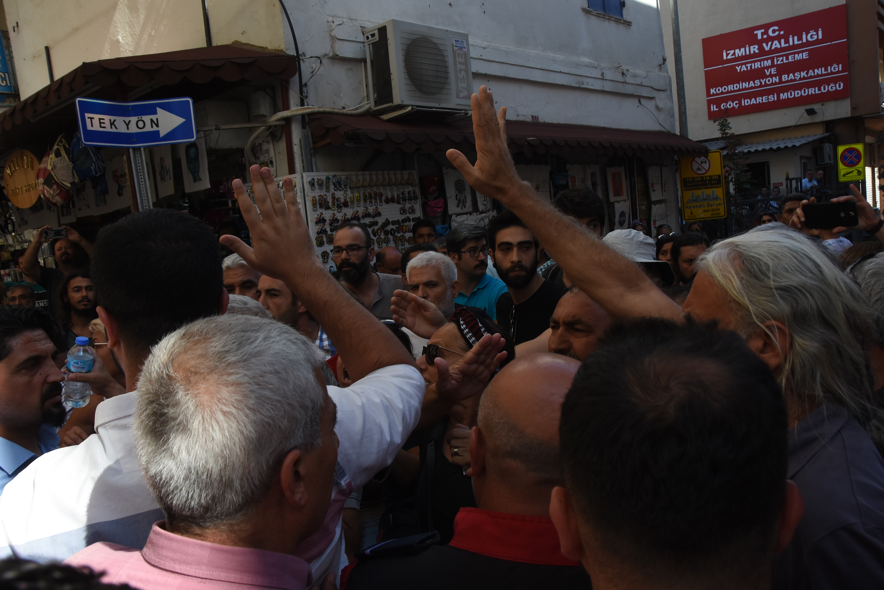 Bina içinde yapılan basın açıklamasının ardından dışarıda toplu fotoğraf verilmek istendi. Demokrasi güçleri temsilcileri bina önüne çıktığında emniyet güçlerinin engellemesiyle karşılaştı. Vatandaşlar ve kolluk kuvvetleri arasında kısa süreli bir gerginlik yaşandı. Kalabalık, 'Direne direne kazanacağız' sloganları attı. Daha sonra Ege Bölge Temsilcisi Sarı, 'Arkadaşlar binamızın önünde toplu bir fotoğraf çekeceğiz ve dağılacağız. Tepkimizi dile getirdik. Emniyet mensubu arkadaşlar bize müsaade etsin' dedi. Bunların ardından fotoğraf çekimi gerçekleşti ve kalabalık olaysız bir şekilde sokağı terk etti.
