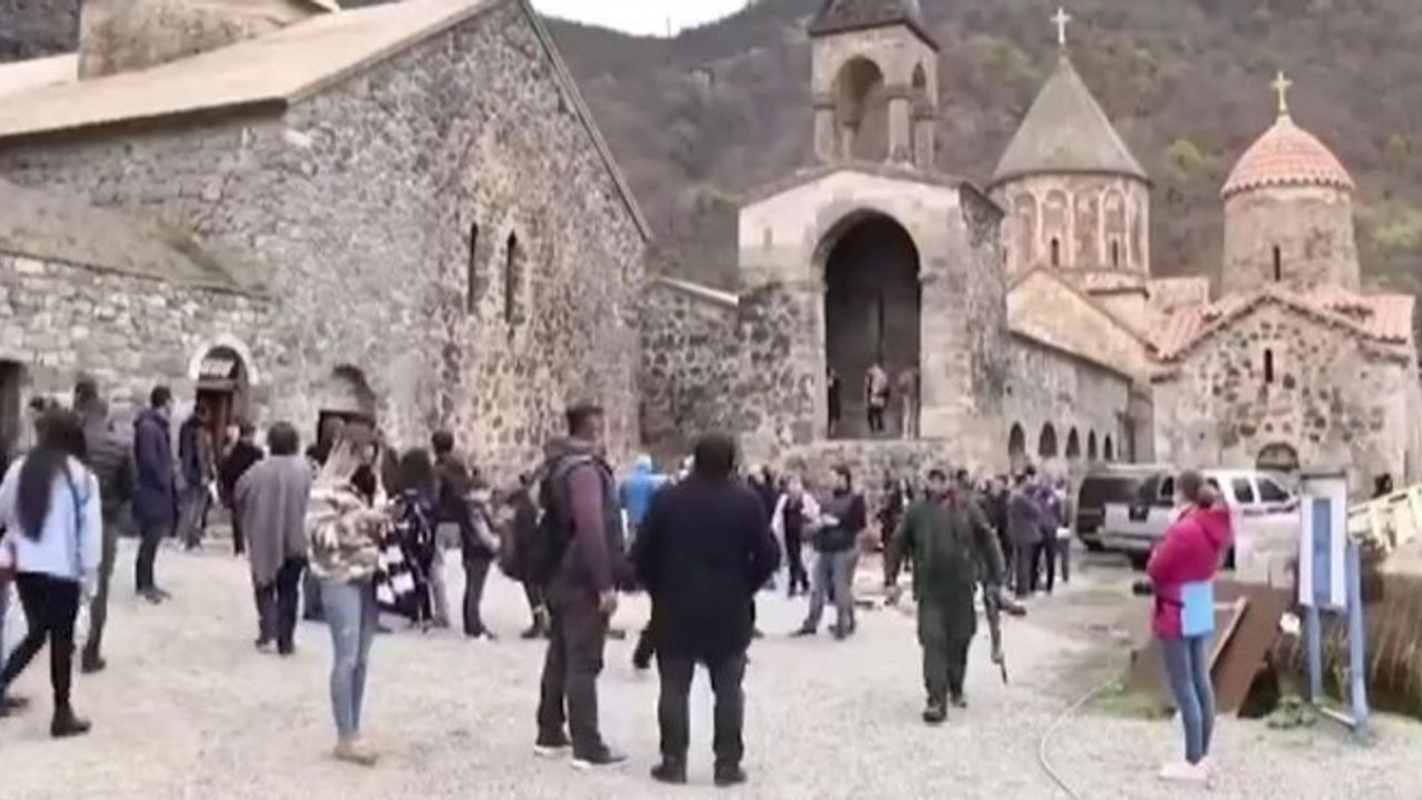 Ermeniler ise Kelbecer'deki antik kilisede son kez ayin düzenledi. Kilise papazına sarılan Ermeniler, yıllardır işgal ettikleri kentleri bugün terk ediyor. (DHA)