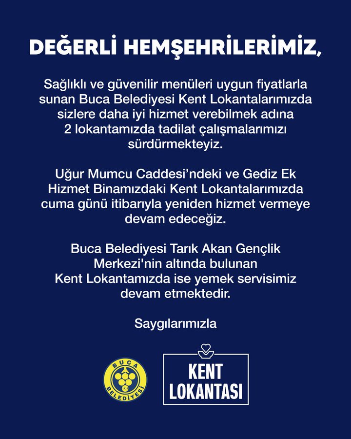 Buca Belediyesi tarafından sosyal medya hesapları üzerinden yapılan açıklamada, iki kent lokantasının tadilatta olduğunu belirtildi.