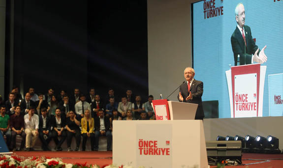 Bir, Türkiye'de demokrasinin hukukun üstünlüğü. İki, ekonomi. 13 yılda buraya getirdiler. Üç, dış politika. Dört, eğitim, ve beş toplumsal barışımız yani Kürt sorunu. Şimdi buradan diğer siyasetçilere sormak istiyorum. Bizim dışımızda, Türkiye'nin beş temel sorununu dillendiren başka bir siyasi parti var mı? Herkes bir ucundan tutuyor. Oysa sorunu bileceksiniz. Neden bizim seçim bildirgelerimiz örnek alınıyor? Çünkü bunları yapacak kadroları yok, bilgileri yok, birikimleri yok. Bilgi birikim ve kadro sadece ve sadece CHP'de var.