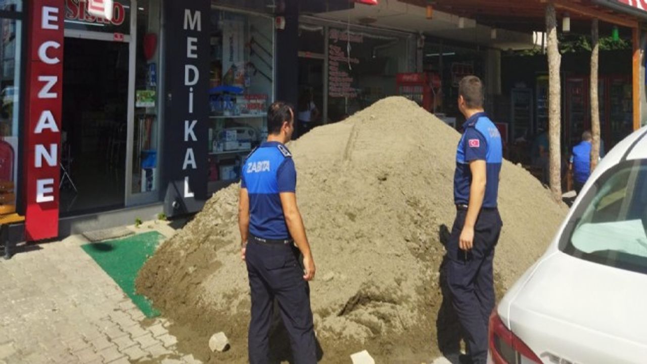 İhbar üzerine iş yerinin önüne gelen zabıta ekipleri, kiracısını çıkartmak için kendi iş yerinin önüne kumla kapatmak isteyen dükkan sahibine Kabahatler Kanunu kapsamında 30 bin TL ceza kesti.