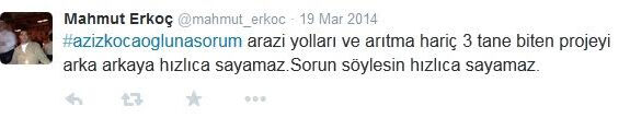 'Aziz Kocaoğlu'na sorum arazi yolları ve arıtma hariç 3 tane biten projeyi arka arkaya hızlıca sayamaz. Sorun söylesin hızlıca sayamaz' ifadelerini kullanmıştı.
