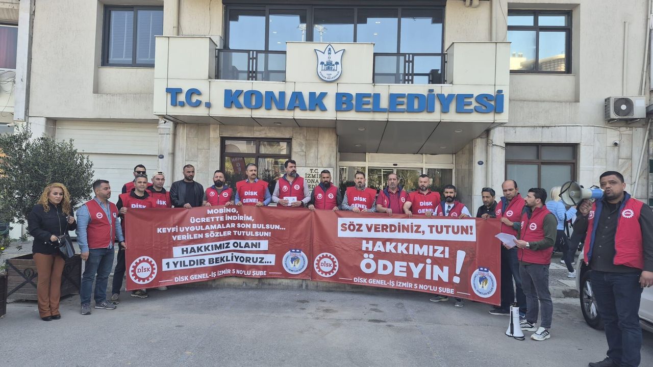 DİSK’e bağlı İzmir Genel-İş 5 Nolu Şubesi, belediye önünde gerçekleştirdiği basın açıklamasında işçiler, haklarını bir yıldır alamadığını dile getirdi. Basın açıklamasında ayrıca mobbing, ücrette indirim, keyfi uygulamalar gibi konulara da değinildi. Her bir işçinin en az 70 bin TL alacağı bulunduğu kaydedildi.