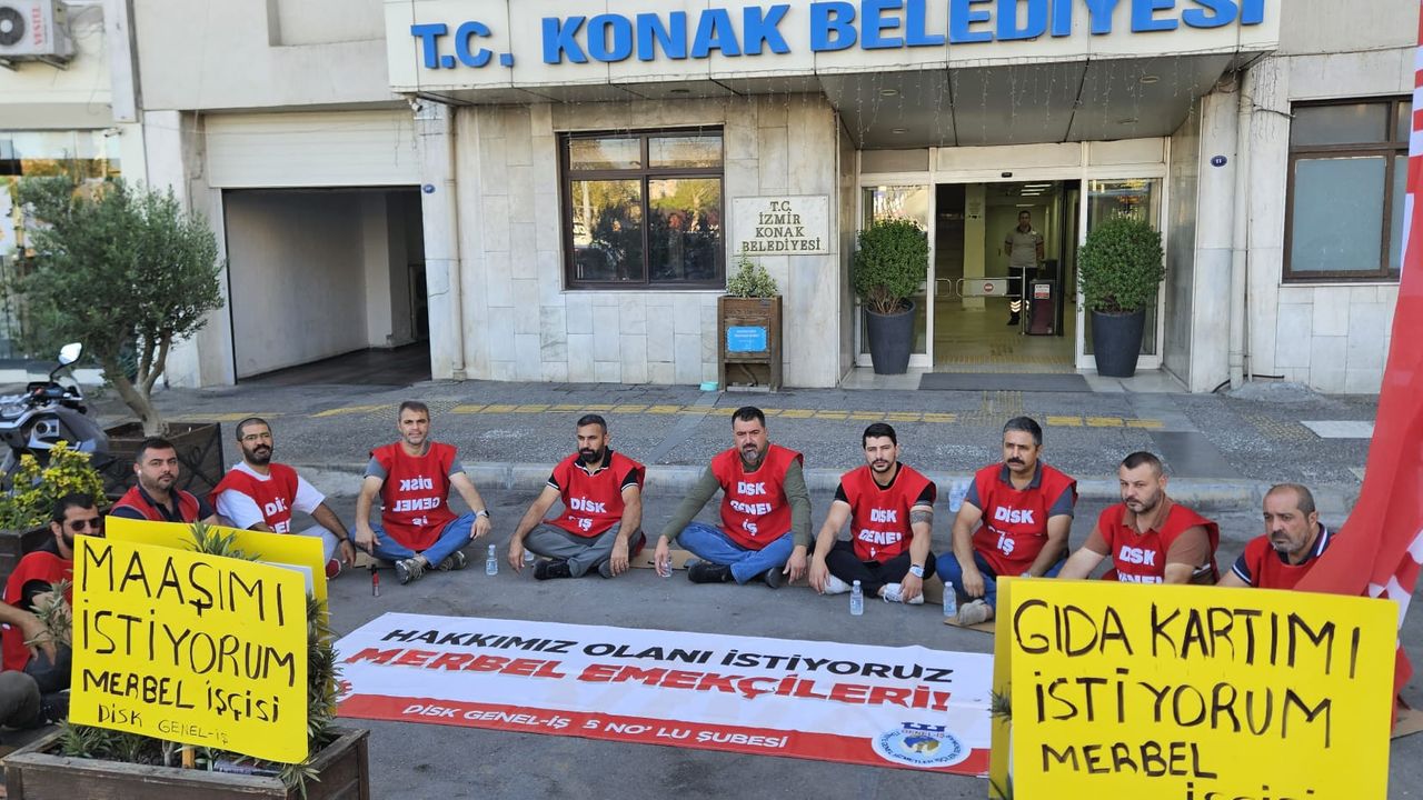 EGEDESONSÖZ- Konak Belediyesi’nde görev yapan Merbel işçileri, maaşlarının eksik yatırılması ve sosyal haklarının ödenmemesi nedeniyle belediye binası önünde başlattıkları oturma eylemini sürdürüyor.