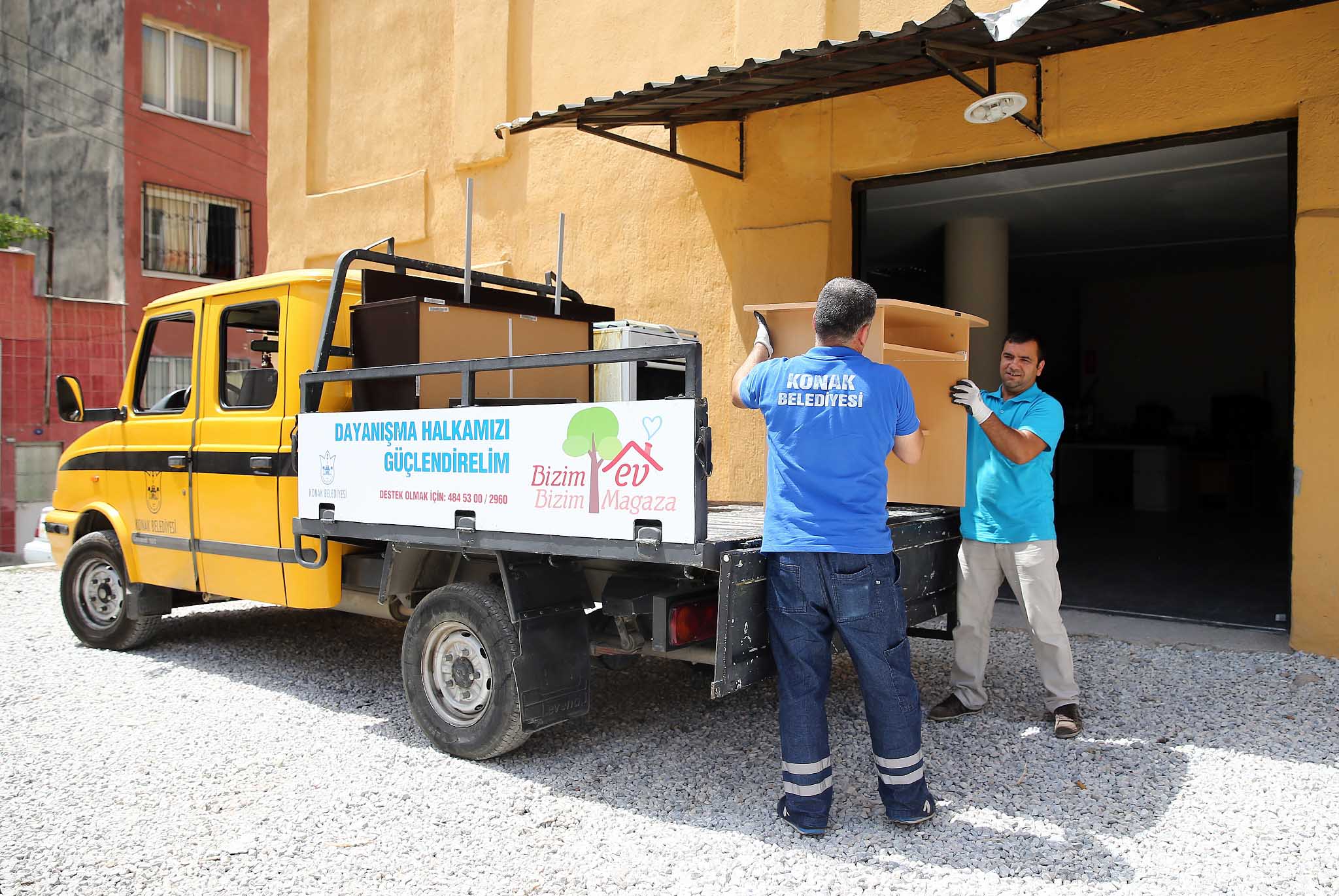 Kurulduğu günden bugüne binlerce aileye destek olan Bizim Ev'den yangın, sel gibi doğal afetlerin yanı sıra maddi imkansızlıklar yüzünden evindeki eşyalarını kaybeden vatandaşlar ile İzmir'e üniversite okumaya gelen ve yurtta kalamadığı için ev kiralayan öğrenciler faydalanıyor. 2017 yılının başından bu yana 212 aileye ihtiyaçları oranında eşya yardımında bulunuldu. Bizim Ev'e kullanmadıkları eşyalarını vermek isteyen vatandaşlar 484 53 00 numaralı telefonu arayarak 2975 dahili hattan görevlilere bağış yapmak istediklerini belirtmeleri yetiyor. Görevliler verilen adresten kullanılabilecek durumda olan eşyaları alıp, Bizim Ev'e getiriyor. İkinci el eşyaların yanı sıra mağaza sahipleri tarafından sıfır eşyalar da bağışlanabiliyor. İkinci el eşyalar içinde yer alan koltuklar yıkandıktan sonra ihtiyaç sahiplerine veriliyor. Özellikle beyaz eşya ihtiyacının çok fazla olduğunu belirten yetkililer daha çok beyaz eşya bağışına ihtiyaç duyulduğunu dile getiriyor.