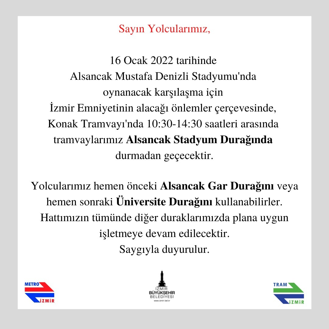 Saat 13:30'da Alsancak Mustafa Denizli Stadı'nda oynanacak maç nedeniyle Konak Tramvayı 10:30-14:30 saatleri arasında Alsancak Stadyum durağında durmayacak.
