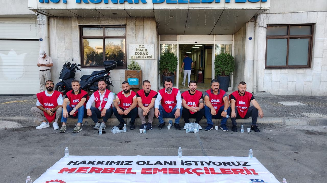 EGEDESONSÖZ- Konak Belediyesi’nde çalışan Merbel işçileri, maaşların eksik ödenmesi ve sosyal hakların yatırılmaması nedeniyle belediye binası önünde başlattıkları oturma eylemine devam ediyor.