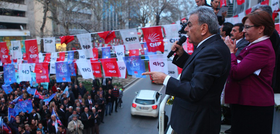 Basmane'deki Merkez Seçim Ofisi'nin açılış töreni ise tam bir mitinge dönüştü. İzmir Büyükşehir Belediye Başkanı Aziz Kocaoğlu'nun yanı sıra Parti Meclisi (PM) Üyesi ve İzmir Milletvekili Alaattin Yüksel, İzmir Milletvekilleri Mustafa Moroğlu, Hülya Güven, Musa Çam, İl Başkanı Ali Engin ile CHP'li belediye başkan adaylarının da katıldığı törende çok sayıda partili de hazır bulundu. Seçim otobüsü üzerinden partililere seslenenlerin konuşmaları işaret dili eğitmeni tarafından anında çevrildi. İlk konuşmayı CHP İl Başkanı Ali Engin yaptı. CHP'li belediyelerin çalışmalarını öven Engin, 'Biz kolay olana değil, zor olana talibiz. İzmir'i tüm halkın bir arada barış içerisinde yaşadığı, bütün inançlara saygının sürdüğü kent yapmaya devam edeceğiz. Çünkü biz İzmirliyiz, çünkü biz Cumhuriyetçiyiz, Atatürkçüyüz, Sosyal demokratız' dedi. İzmir Milletvekili Mustafa Moroğlu ise yaptığı konuşmada, İzmir'in geleceği için Aziz Kocaoğlu'nun önderliğinde birleşme çağrısında bulundu.