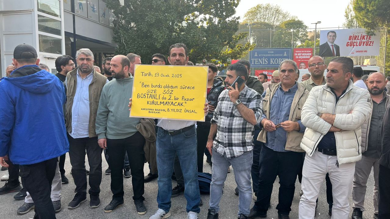 Salonun önünde Karşıyaka Bostanlı’da bulunan Pazar Yeri’nin kapatılmasına tepki gösteren pazar yeri esnafı protesto düzenledi.