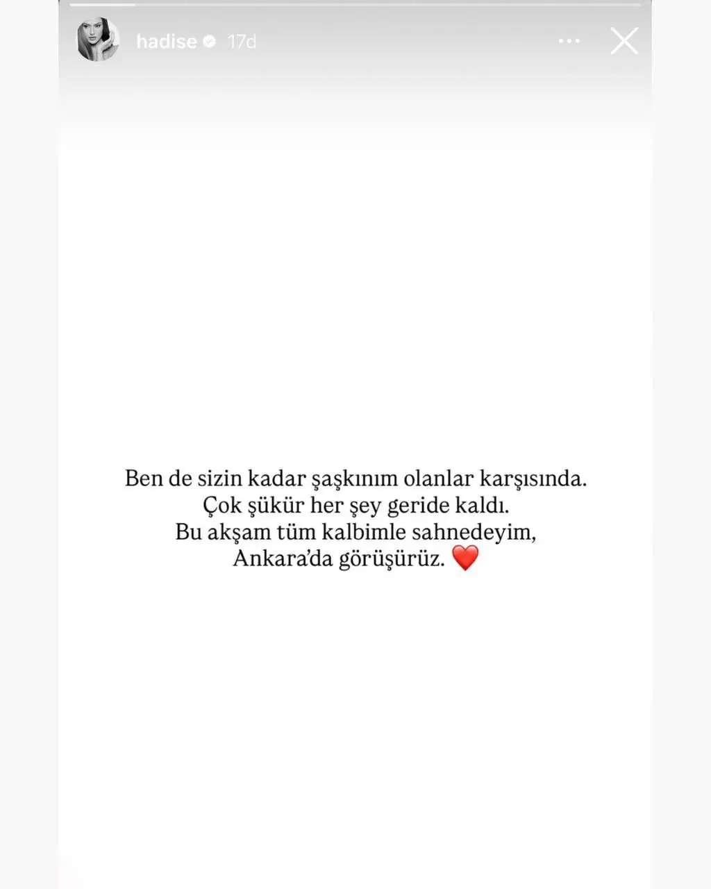 "Ben de sizin kadar şaşkınım olanlar karşısında. Çok şükür her şey geride kaldı. Bu akşam tüm kalbimle sahnedeyim, Ankara'da görüşürüz"