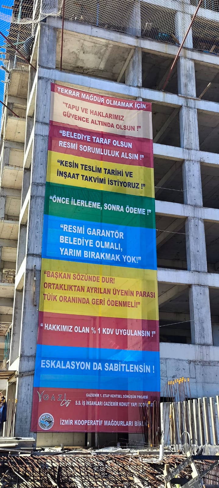 Alpyavuz açıklamasında, “Oysa bu projelerin temelleri atılırken yanımızda belediye başkanları, siyasiler, bürokratlar vardı. Açılış törenlerinde fotoğraflar çekildi, “İzmir modeli” denildi, “Sosyal Konut Başarısı” diye anlatıldı. Bugün aynı kişiler sessiz. Ne belediye var, ne parti temsilcileri. Hiç biri 5000 ailenin çığlığını duymak istemiyor. 1,5 Yıldır Çürüyen İnşaatlarımız, Tükenen Umutlarımız. İnşaatlarımız tam 1,5 yıldır duruyor. Betonlar çatlıyor, demirler paslanıyor, ama en çok da bizlerin umutları çürüyor. Bu süreçte ne İzmir Büyükşehir Belediyesi ne de projeyi sahiplenen Cumhuriyet Halk Partisi, mağdurların yanında durdu. Komisyonlar, çözümler hep sözde kaldı. Ne yüzlerini gördük ne de seslerini duyduk. Oysa biz bu kooperatiflere sadece paramızı değil, güvenimizi, emeğimizi ve geleceğimizi teslim etmiştik” ifadelerine yer verdi.