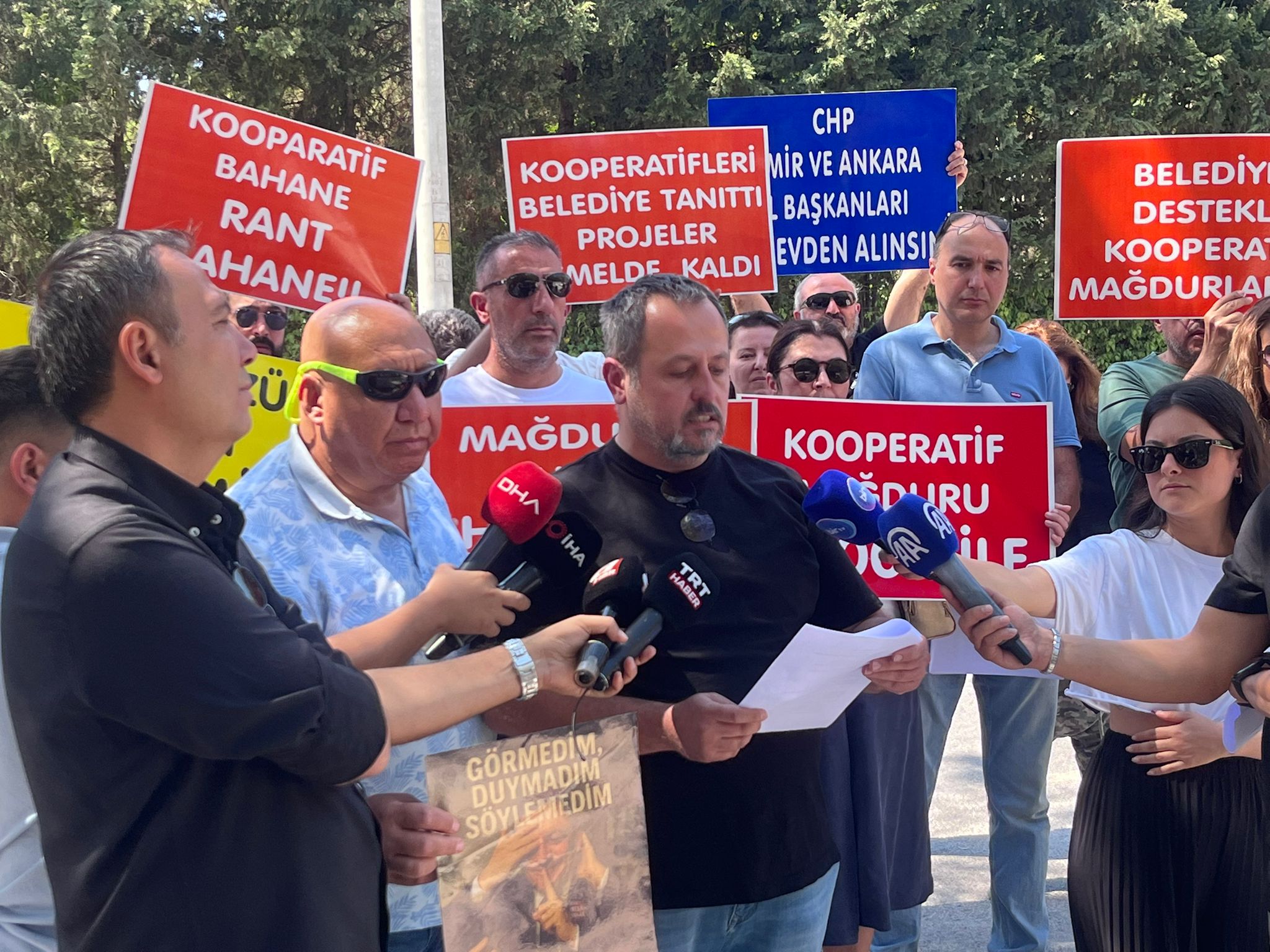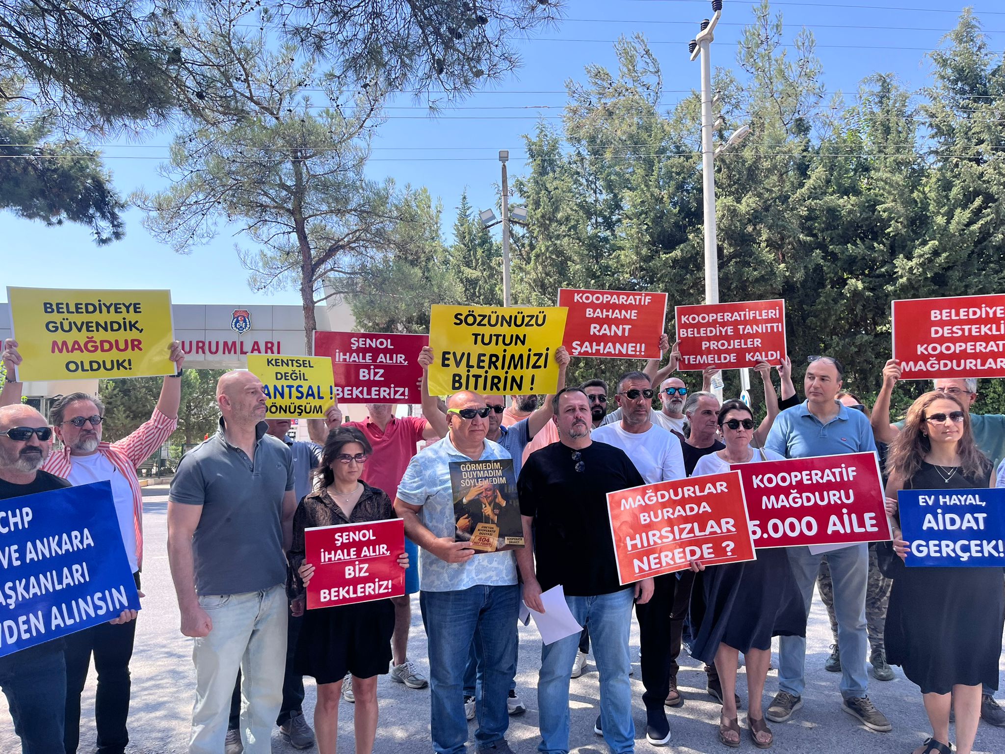 Kooperatif soruşturması kapsamında tutuklu bulunan CHP İzmir İl Başkanı Şenol Aslanoğlu ile eski İzmir Büyükşehir Belediye bulunduğu Buca Ceza İnfaz Kurumu önünde toplanan grup, "Belediyeye güvendik, mağdur olduk", "Mağdurlar burada, hırsızlar nerede?" yazılı pankartlar taşıdı.