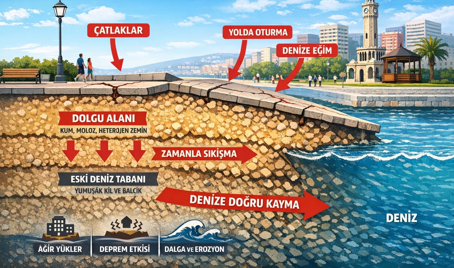 Prof. Dr. Doğan Yaşar açıklamasında, “Biz çöküyoruz. İzmir dolgu üzerine kurulan bir şehir. Basmane’den denize kadar olan her yer dolgu alanı. Dolgu olunca İzmir yavaş yavaş çöküyor. Yılda 1 santim çökme yaşanıyor. 1873 yılında kordon boyu yapılırken deniz fuarın oralardaydı. O zamanlar ihale şartnamesi yapılırken Kordon boyu en az 1,5 metre üzerinde olacak şekilde inşa edilecek. Maddede, su ne kadar kabarırsa kabarsın en az 1,5 metre üzerinde olacak şekilde inşa edilecektir yazıyor. Eski Rum evlerine merdivenle çıkılırdı. Çünkü herkes İzmir’in çöktüğünü biliyor. İzmir çöktüğü ve deniz yükseldiği için taşkınlar meydana geliyor” dedi.