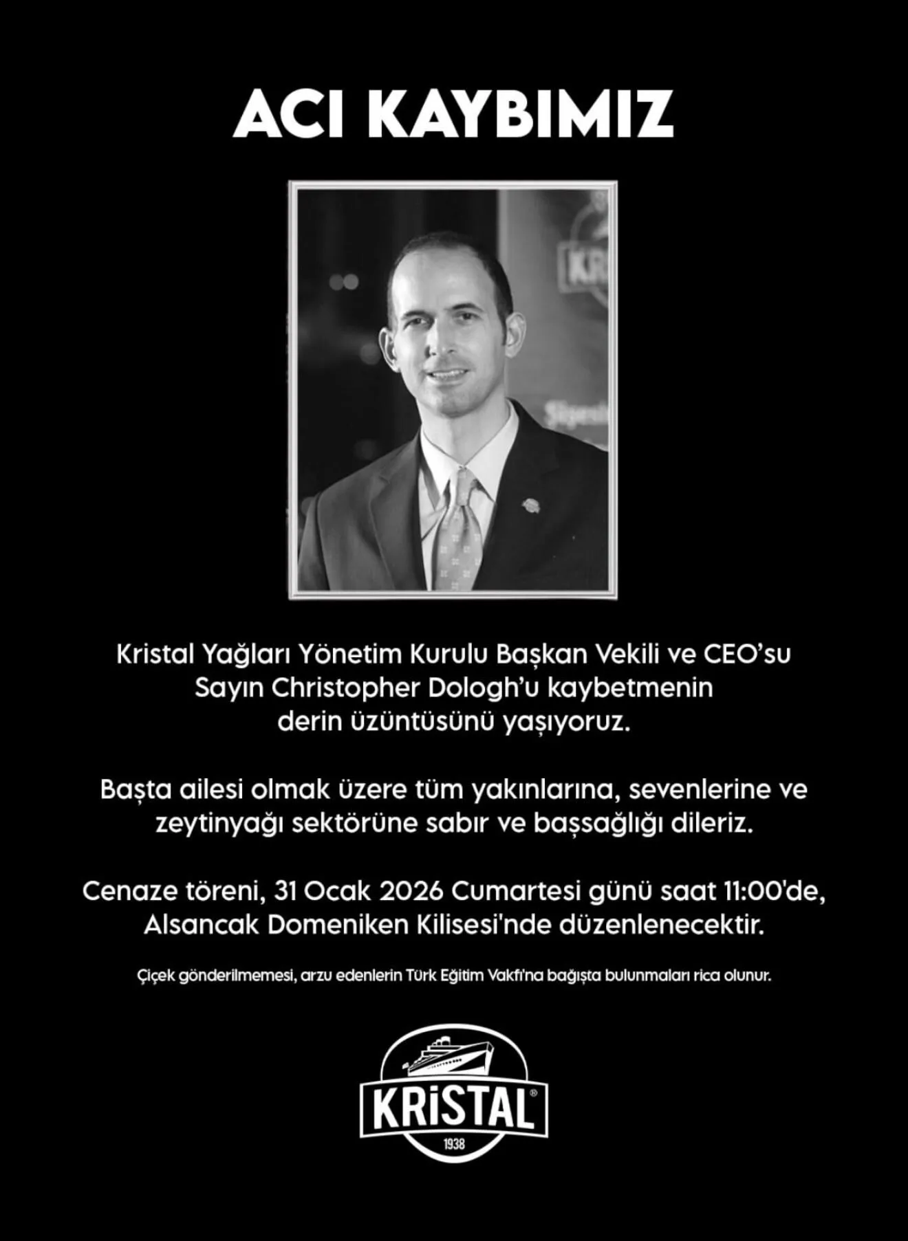 Kristal Yağları tarafından yapılan paylaşımda, “Christopher Dologh’un sektöre kazandırdığı kalıcı değerleri her zaman saygıyla anacağız. Kristal Yağları olarak, iş dünyasına bıraktığı değerleri ve ilham verici katkılarını şükranla hatırlayacağız” ifadeleri yer aldı.