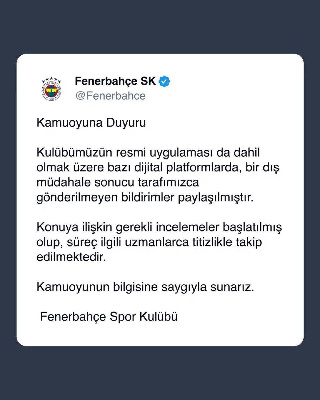 Söz konusu duruma ilişkin Fenerbahçe'den bir açıklama yapıldı. Yapılan açıklamada şu ifadeler kullanıldı: