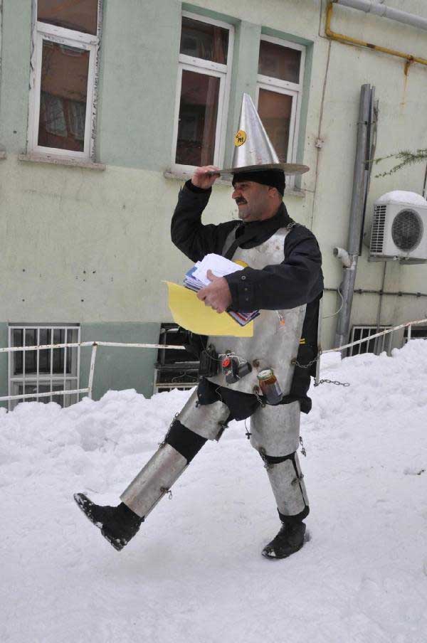 Nevzat Çoban sacdan yaptırdığı şapkayı kafasına, buzdan kaymamak için de ayağına zincir taktı. Çoban, şapkası ve ile giydiği zırhın kendini olası tehlikelerden koruduğunu ifade ederek şunları söyledi: 'Bu kıyafet başınıza gelebilecek tüm belaları kesinlikle bertaraf eder. Kafadaki şapka mektup dağıtırken çatılardan tepenize düşen kiremit, buz saçağı, icra tebligatı götürdüğünüz insanların pencere ve balkonlardan attığı saksı, terlik gibi belaları savar. Kurşun geçirmez özelliğiyle kurşun sıkanlar olursa bu kıyafet aynı zamanda kurşun savardır. Sopayla vuranlar olursa sopa savar, dayak savardır, köpek savardır. Ayağımdaki zincirler buzda kaymayı önler, buz savardır. Yanımda taşıdığım kavanozdaki bal ile emzik de siyasi Bu bal ve emzik de siyasi ve vekil savardır. Çünkü bizler 30 senedir postacılara yıpranma hakkı istedikçe sayın siyasiler ve vekillerimiz vereceğiz diye ağzımıza bir parmak bal sürmekte ve emzik vererek bizleri susturmaktadırlar. 30 yıldır siyasilere ve vekillere inancımız kalmadığı için bal ve emziği karşıdan gösterdiğimiz zaman bunlar yanımıza dahi yaklaşamamaktadırlar. Sayın vekillerimiz yıpranma hakkını bize değil jet yasayla kendilerine çıkardılar. Bizden daha zor şartlar altında çalışıyorlarmış ve yıpranıyorlarmış. Sayın vekillerimizin fazla yıpranmamaları için bu kıyafeti kendilerine tavsiye ediyorum.'(dha)