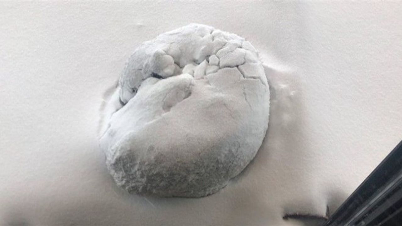 Uzaktan bakıldığında hiç fark edilmeyen köpek bir süre sonra uyandığında karla kaplandığını fark etti. Ardından da yerinden kalkınca üzerindeki karlar döküldü. Köpek daha sonra sahibi tarafından garaja alındı. O anlar ise kameraya yansıdı. (DHA)