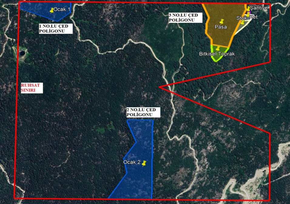 Her iki ÇED sahası da Aydın-Muğla-Denizli Planlama Bölgesi 1/100.000 ölçekli Çevre Düzeni Planı’na göre ‘orman alanı’ ve ‘önemli doğa alanı’ sınırlarında kalıyor. Her iki ocak sahasında da hammadde dinamit patlatma yöntemiyle çıkarılacak.